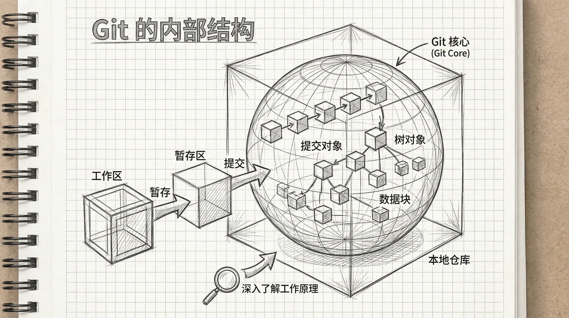 但Git还有另一套命令,这些命令就像墙里的水管、电线、管道。它们不那么美观,但它们是整个系统的基础。这些“水管命令”能让你直接操作Git的内部数据结构。 在这一节里,我们将深入“墙壁内部”,探索这些水管命令的秘密。虽然你平时可能不会直接使用它们,但了解它们的工作原理,能让你真正理解Git是如何思考的。
