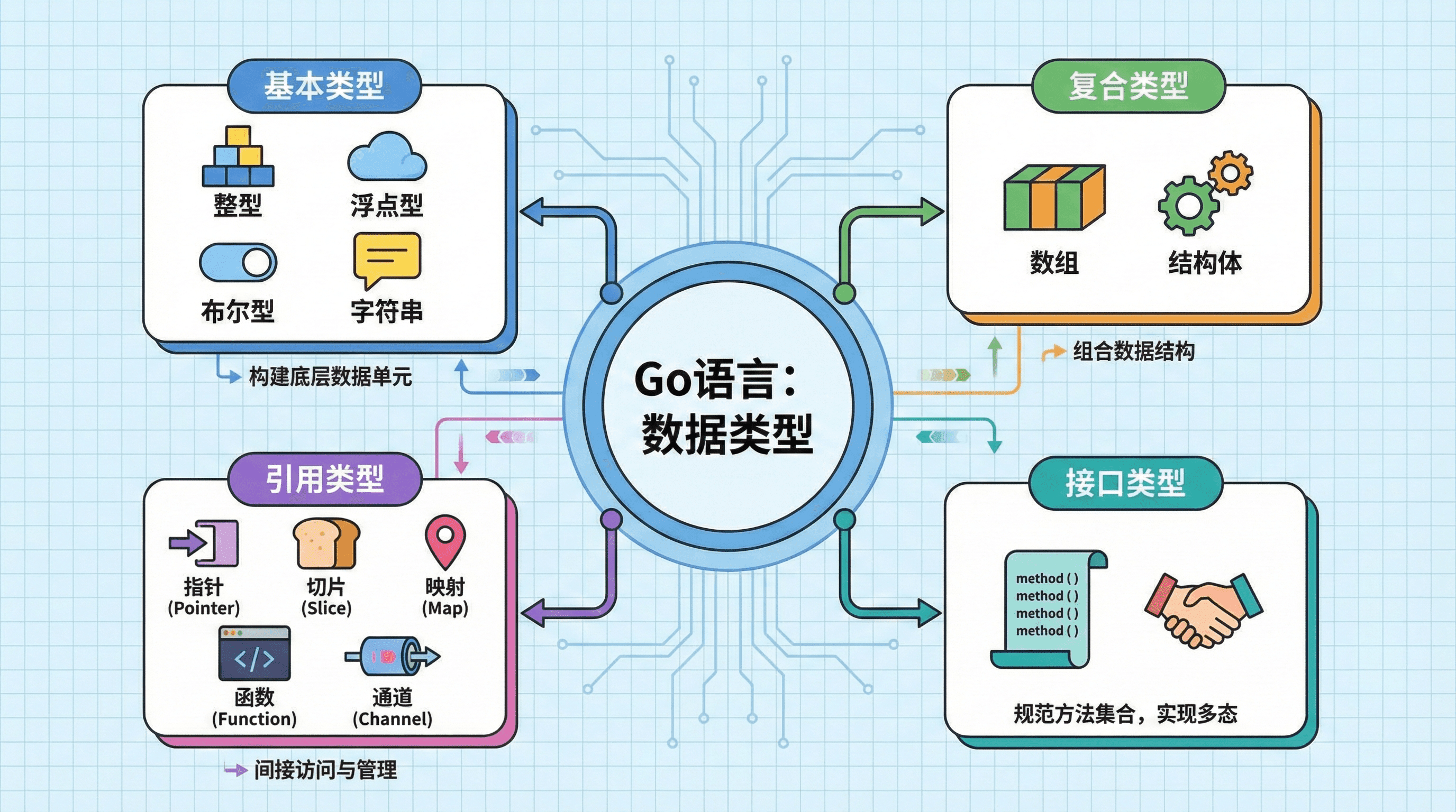 Go 语言中的数据类型体系主要分为以下四类: