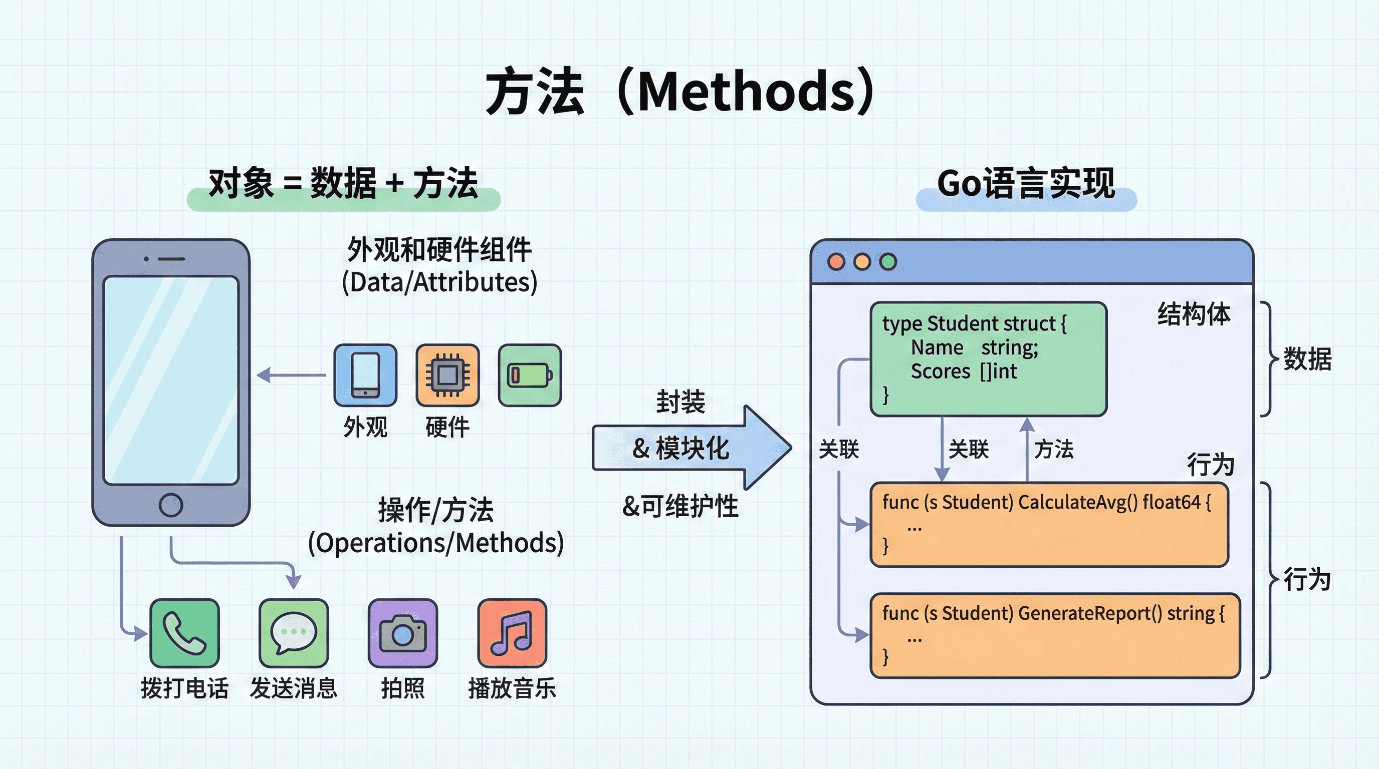 在 Go 语言中,对象常表现为结构体(struct),而“方法”指的是与特定类型(通常为结构体)关联的函数。以“学生”为例,我们可以定义一个 Student 类型,并为其实现“计算平均分”、“生成成绩单”等操作。这些绑定到类型上的操作即为方法,它们不仅丰富了对象的行为,也提高了代码的模块化和可维护性。
