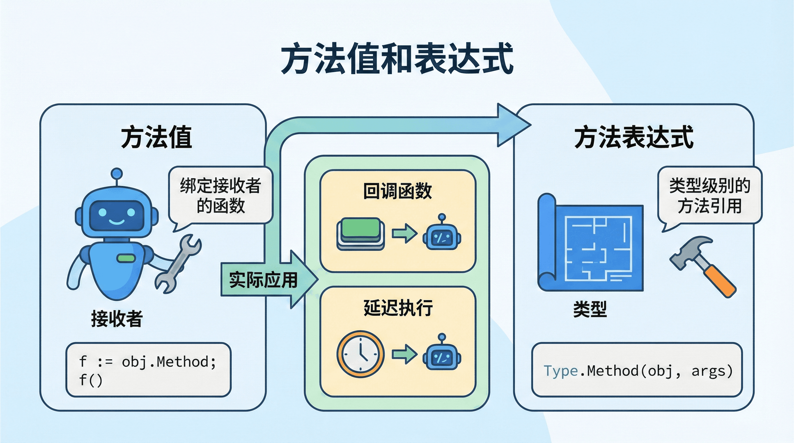 方法值在实际编程中有很多有用的应用场景。当我们需要将方法作为参数传递给其他函数时,方法值特别有用。 这种做法在函数式编程风格中很常见,可以让我们的代码更加灵活和可重用。