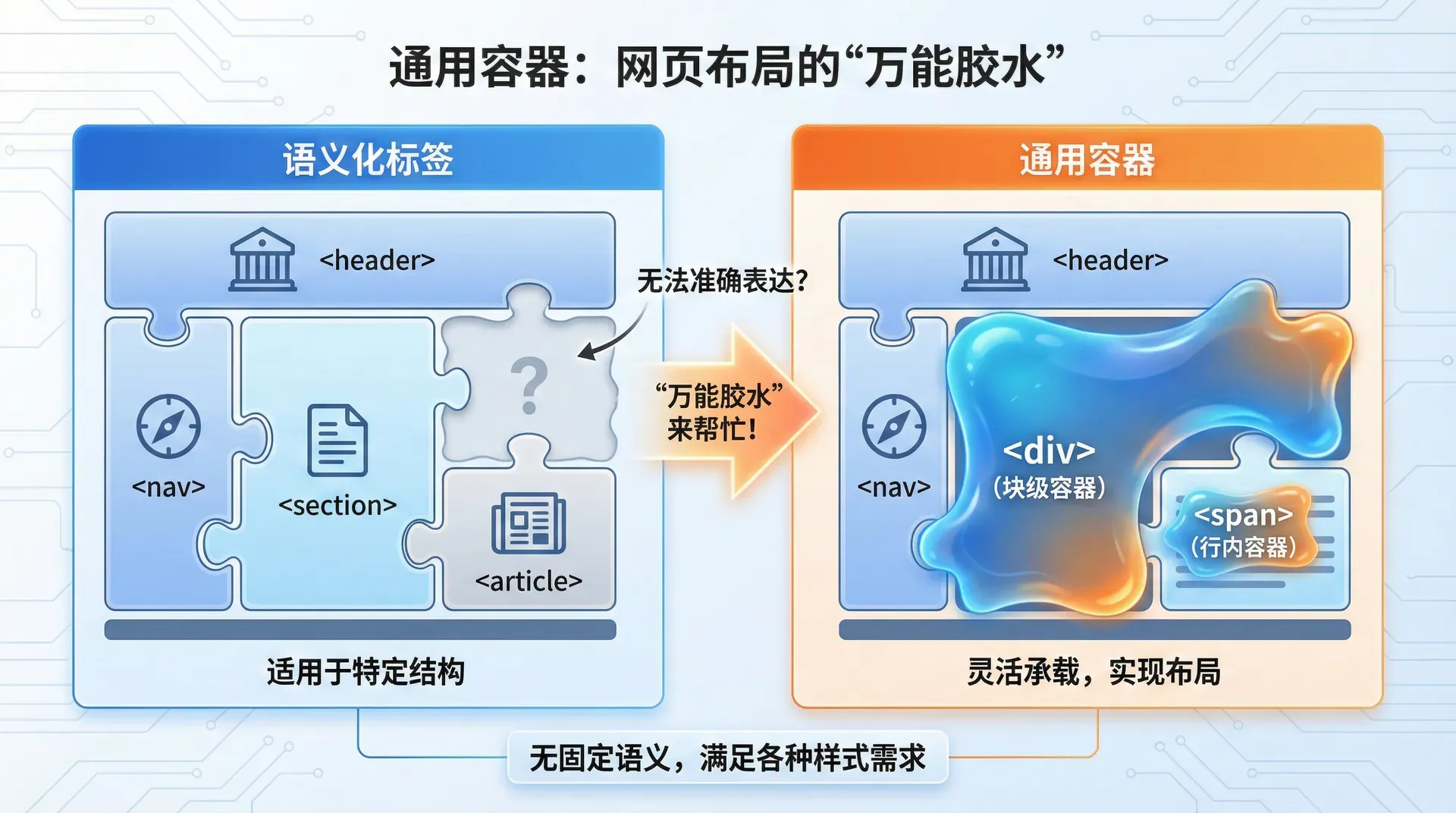 这个时候,<div> 和 <span> 就像是我们网页布局的“万能胶水”——它们没有固定的语义,可以灵活地承载任何内容,帮助我们实现各种布局和样式需求。