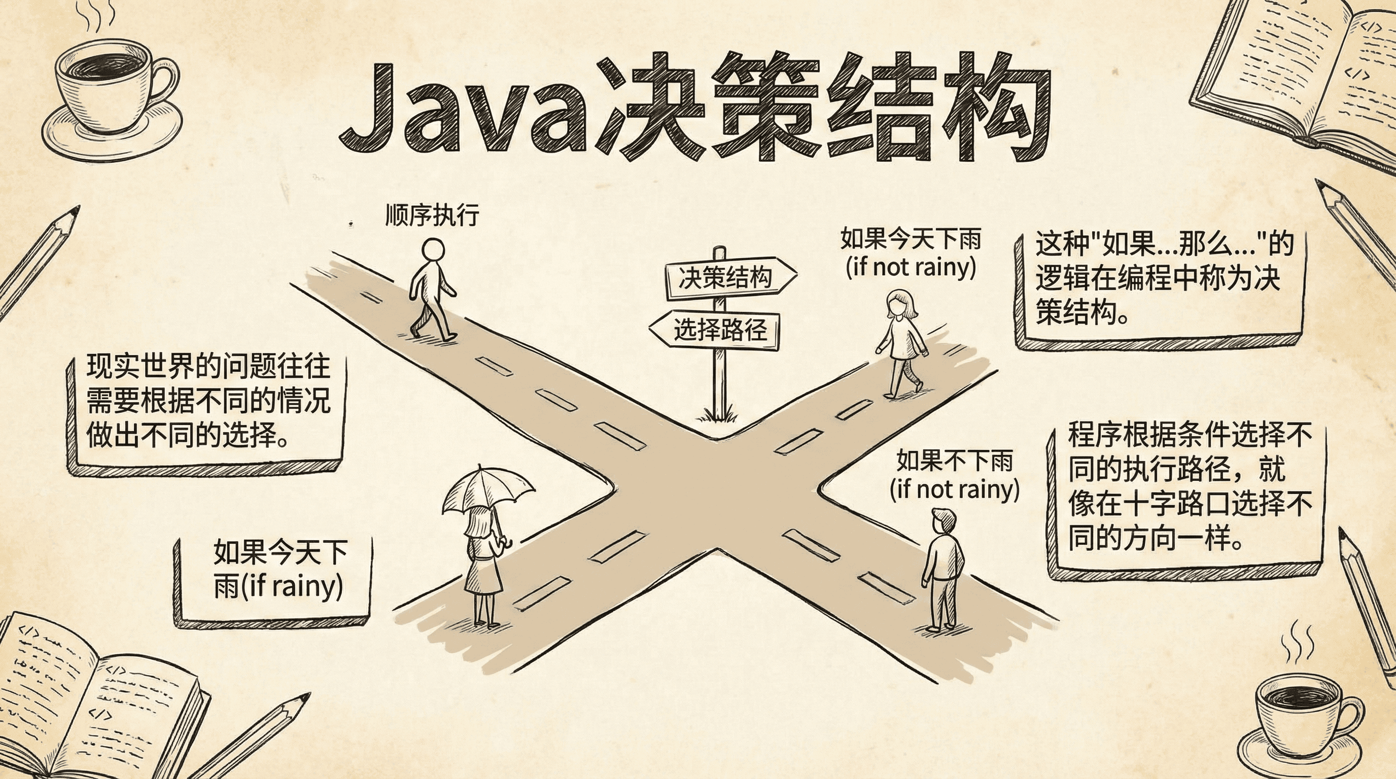 决策结构让程序能够根据不同的条件选择不同的执行路径,就像在十字路口选择不同的方向一样。Java提供了几种决策结构,让我们从最简单的开始学习。