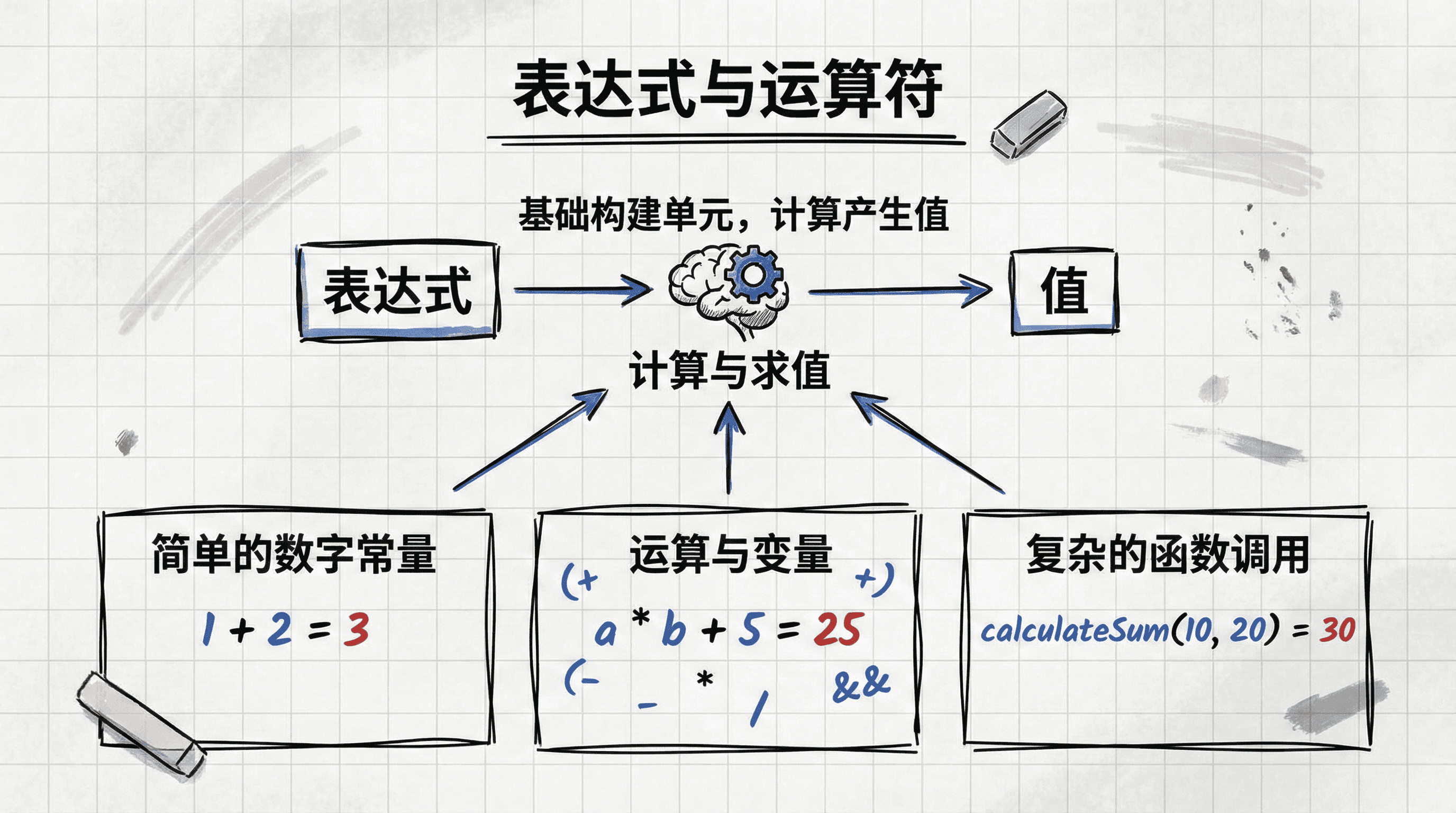 运算符在表达式的构建过程中起着核心作用。它们将操作数(通常是两个)按照特定的方式组合,计算出新的值。乘法运算符就是一个典型的例子,表达式width * height会计算出两个变量的乘积。为了便于理解,我们有时会说运算符“返回”一个值,而不是严格地说“计算出”一个值。