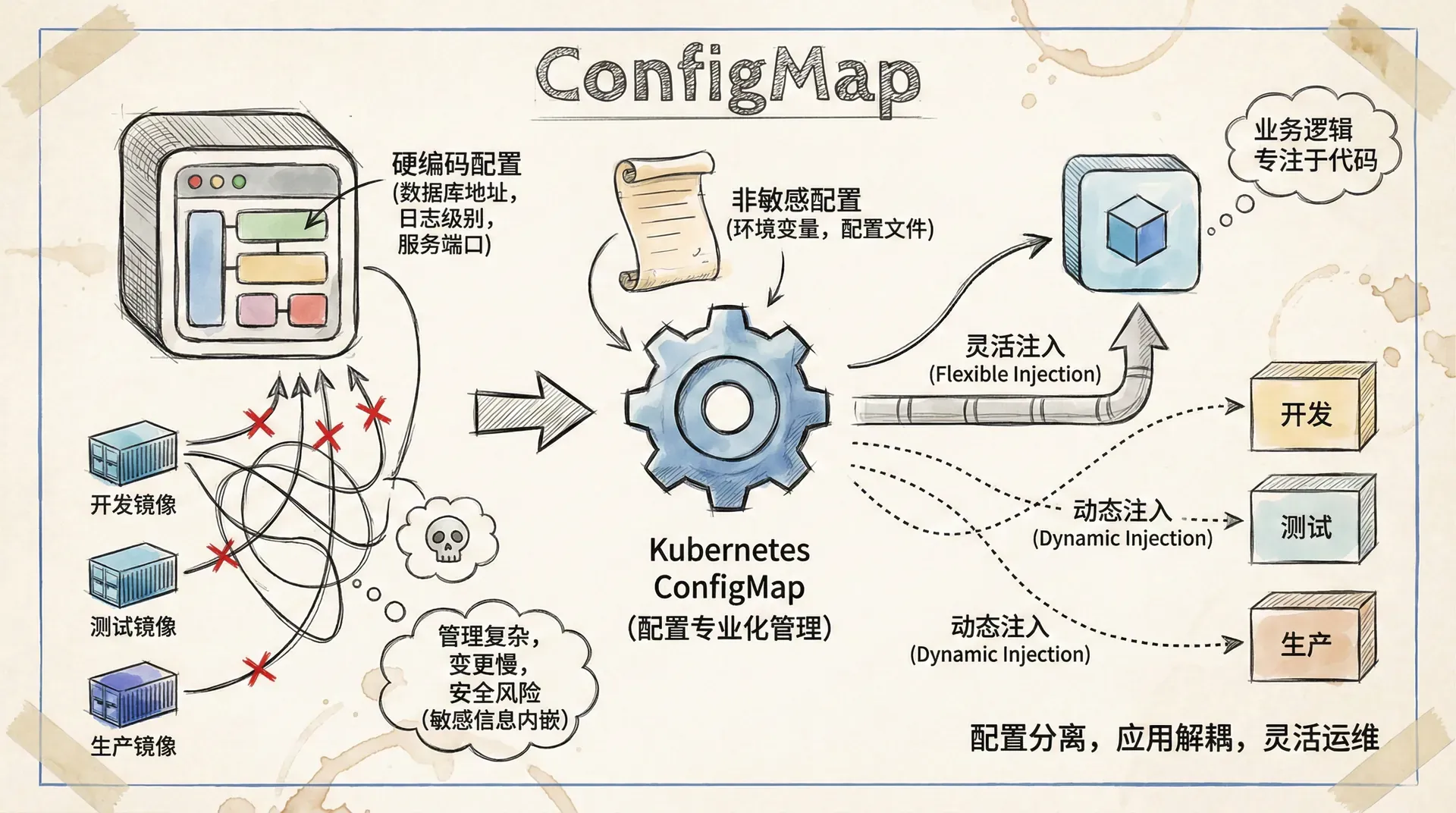 如果将所有配置硬编码在应用程序内部,则每当不同环境(如开发、测试、生产)需要调整配置,便需为每个环境单独构建和部署不同的镜像。这不仅导致了镜像管理的复杂度提升、变更流程变慢,还会埋下潜在的安全隐患(如敏感信息内嵌镜像)。此外,紧耦合的配置还限制了应用的灵活性,增加了运维风险。