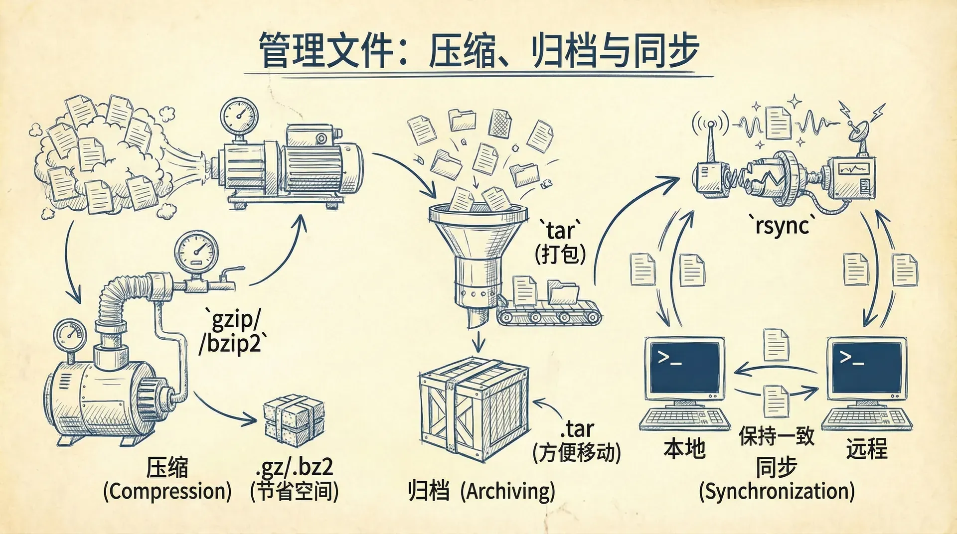 假设你的电脑里塞满了各种文件——文档、照片、代码项目,就像一个堆满杂物的房间。为了让这个“房间”变得井井有条,或者当你需要“搬家”(比如把文件转移到另一台电脑或服务器)时,你会怎么做? 这个过程,在Linux世界里,可以优雅地通过几个命令完成。我们会先学习如何压缩文件,就像用真空袋抽走衣物里的空气以节省空间; 接着是归档,这相当于把一大堆零散的东西“装”进一个大包里,方便管理和移动;最后是同步,它能确保你在两地的文件保持一致,就像一本可以自动更新的魔法笔记。