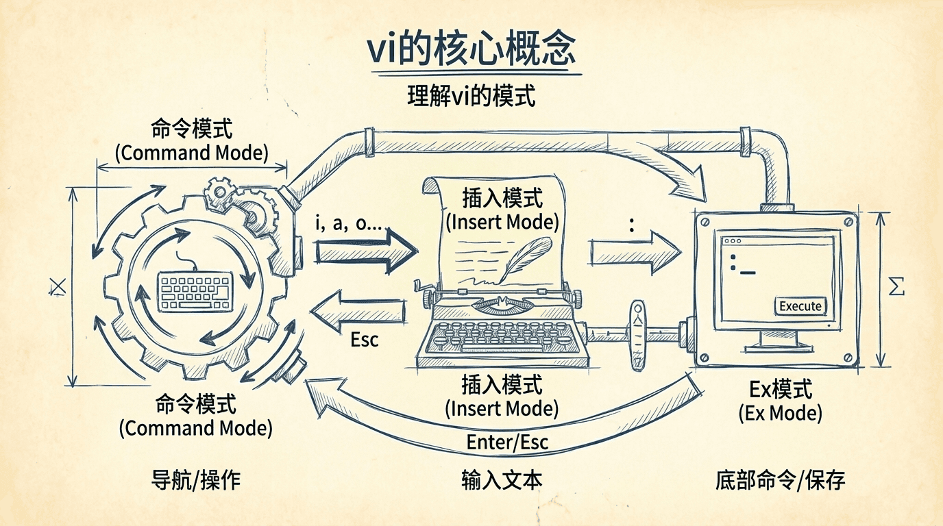 vi最核心也最独特的概念,就是它的“模式”。理 初次打开vi,你所处的并非一个可以随意打字的状态,而是命令模式(Command Mode)。把它想象成一个飞船的驾驶舱,你按下的每一个键,都不是为了输入文字,而是向飞船下达指令,比如“向上移动一行光标”、“删除这个词”、“复制这一段”。 键盘上的大部分按键,此刻都化身为一个个快捷指令。