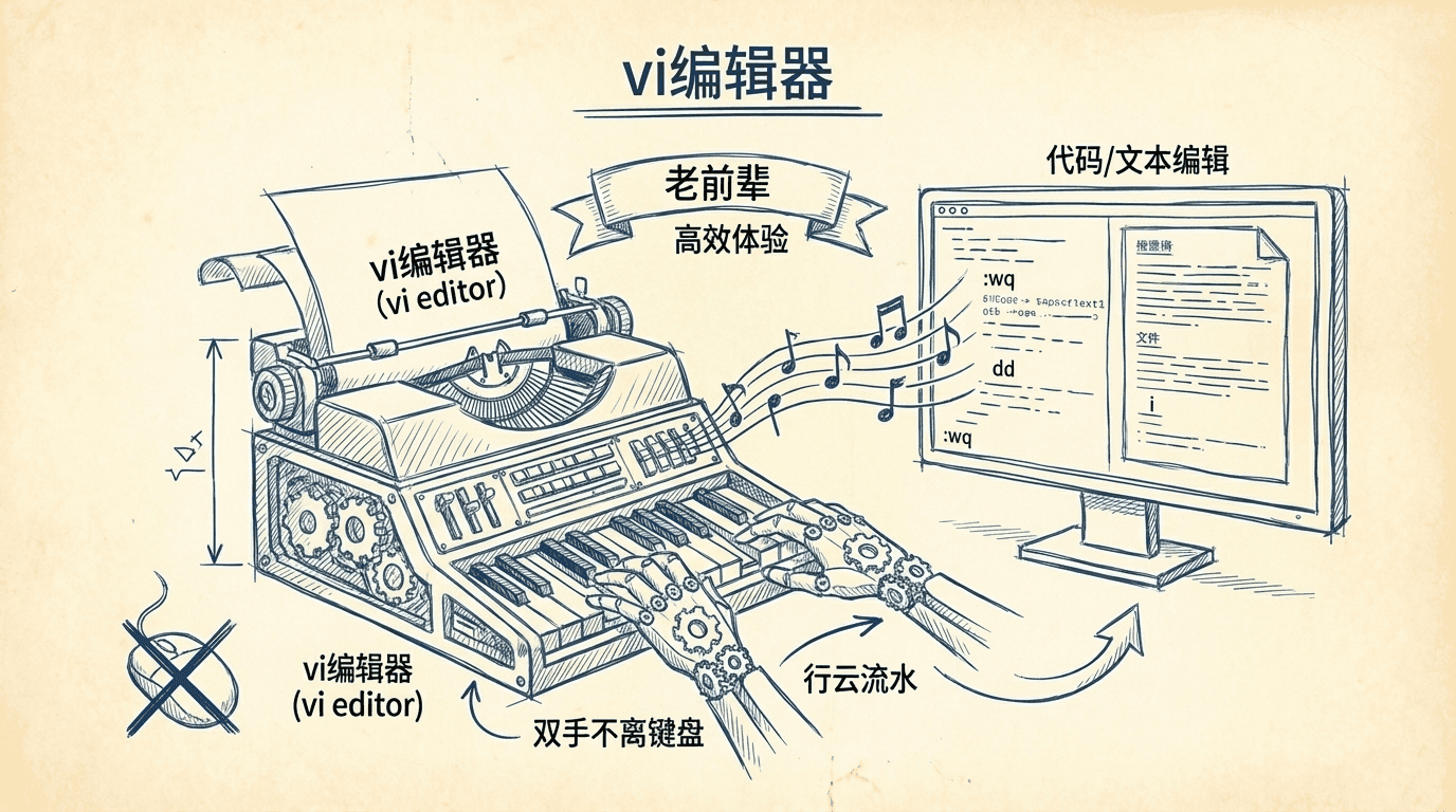 vi是Linux世界里一位“老前辈”,几乎所有和Unix血统相关的系统中,都能看到它的身影。 刚开始接触vi,你可能会觉得它有点奇怪,甚至不太好上手。这很正常,就像初次学习乐器,你总需要时间来熟悉指法和乐理。 一位熟练的vi用户,双手几乎不需要离开键盘,就能像弹奏钢琴一样,行云流水地编辑代码和文本,那种高效的体验是图形化编辑器难以比拟的。