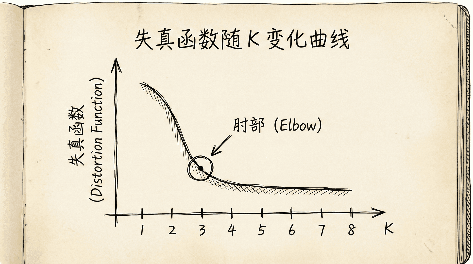 画出失真函数J随K变化的曲线。随着K增大,J会递减(更多的簇意味着点离中心更近)。寻找曲线的"肘部"——J下降速度明显变慢的那个点。