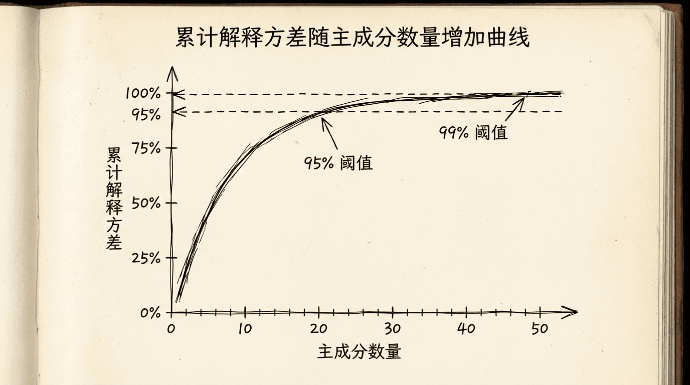 每个主成分解释了原始数据中一定比例的方差。前k个主成分累计解释的方差比例: