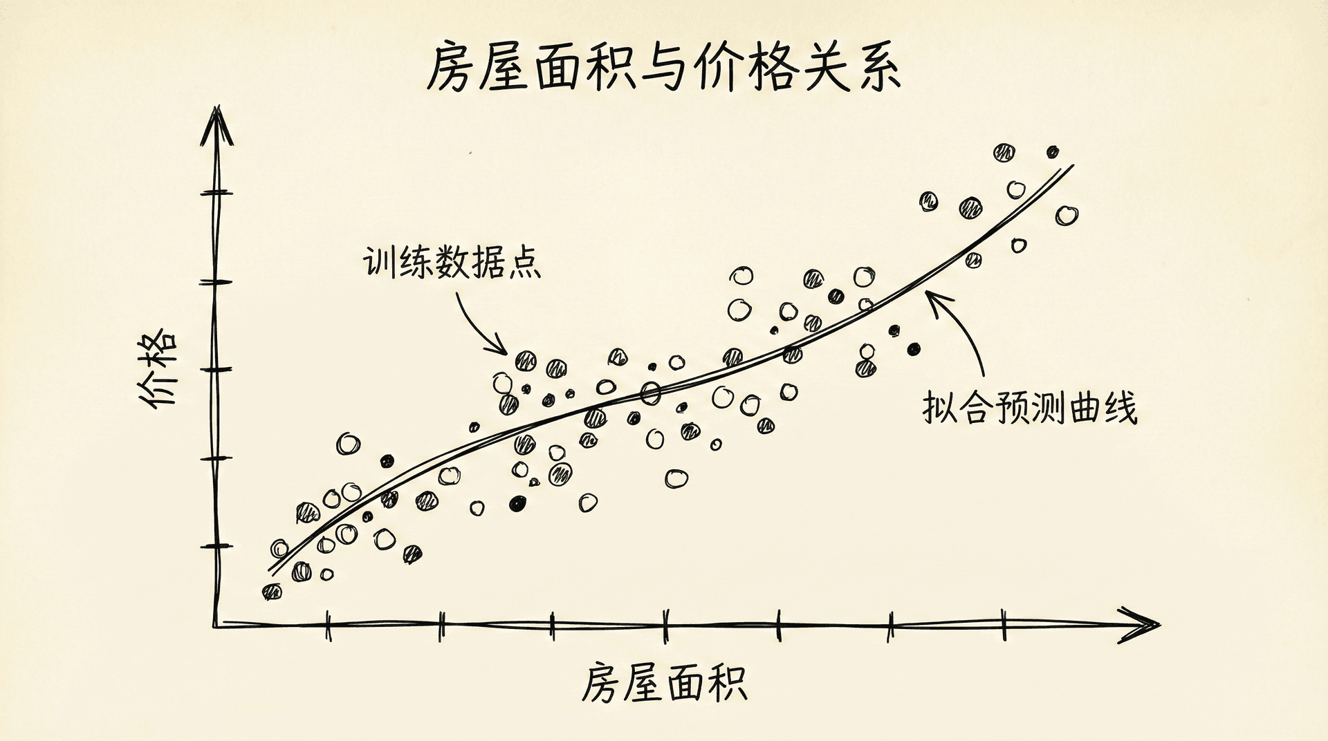 通过监督学习算法,我们可以发现这些特征与房价之间的关系。也许我们会发现,房屋面积每增加一平方米,价格平均上涨五千元;学区评分每提高一分,价格平均上涨十万元。这些关系可能是线性的,也可能是非线性的。算法的工作就是自动发现这些复杂的关系模式。