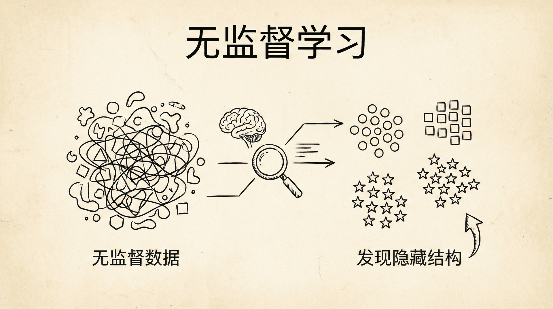想象一个孩子走进一个装满各种玩具的房间。没有人告诉他这些玩具应该如何分类,但他可能会自己把玩具按照相似性归类:把所有的汽车放在一起,把所有的积木放在一起,把所有的毛绒玩具放在一起。这就是无监督学习的直观类比——在没有明确指导的情况下,发现事物之间的相似性和内在结构。