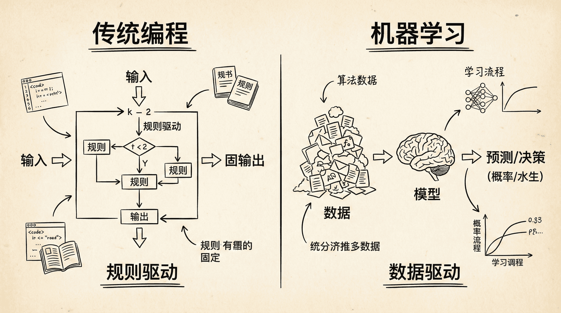 这个简单的过程蕴含着学习的本质:通过经验积累,提取规律,应用到新的情境。而机器学习要做的,就是让计算机也能完成类似的过程。不同的是,人类用神经元和大脑皮层,而计算机用算法和数据。