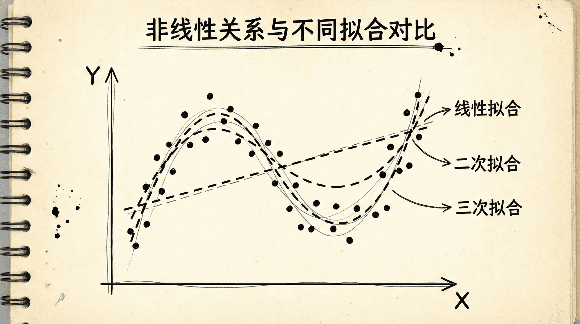 线性回归假设输出与输入特征之间是线性关系。但现实世界的关系往往不是线性的。比如,房价与面积的关系可能不是严格线性的——小户型每平米单价可能更高,超大户型每平米单价可能反而下降。
