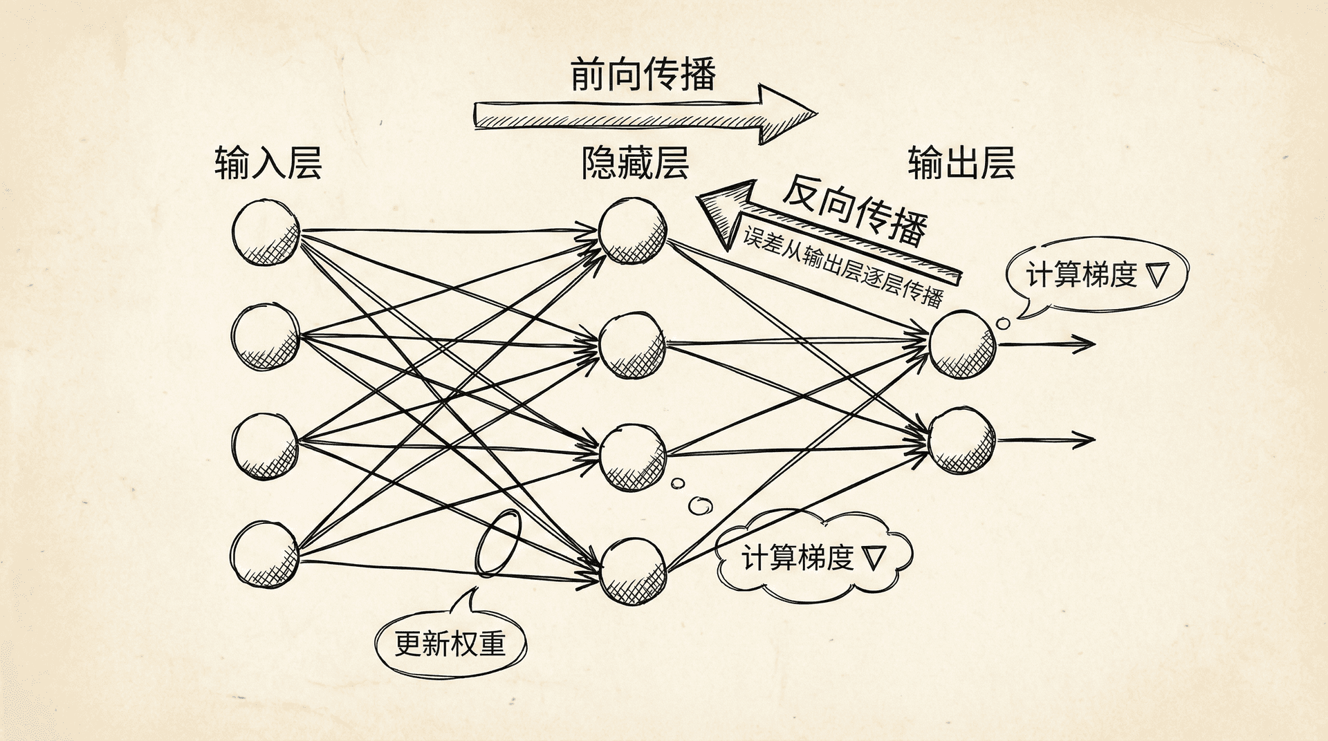 算法的名字“反向传播”来自于它的计算方式:误差从输出层开始,逐层向后传播到输入层。在传播过程中,我们计算每一层的误差,然后用这些误差计算梯度。