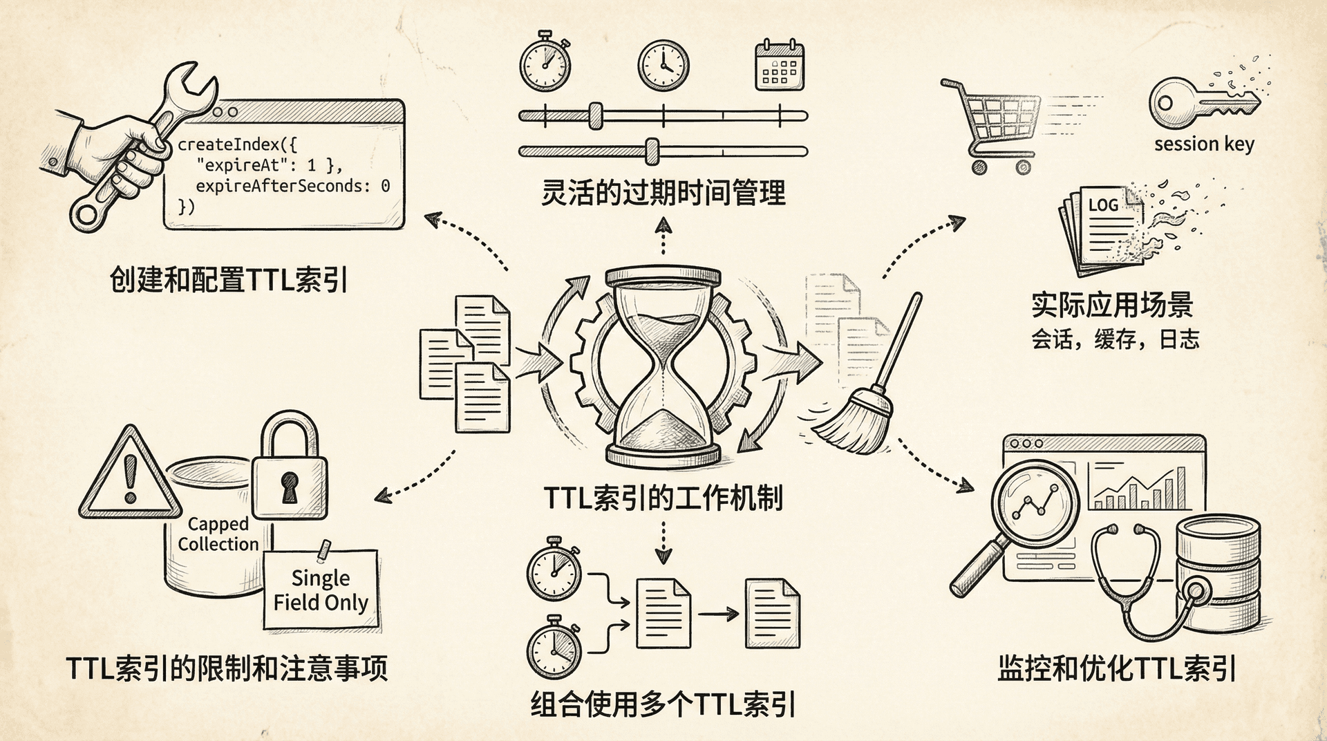 TTL索引为自动化数据生命周期管理提供了强大而优雅的解决方案。通过合理使用TTL索引,我们可以确保系统中的临时数据得到及时清理,保持数据库的健康状态,同时简化应用的维护复杂度。无论是会话管理、缓存系统还是日志清理,TTL索引都能显著提升系统的自动化水平。