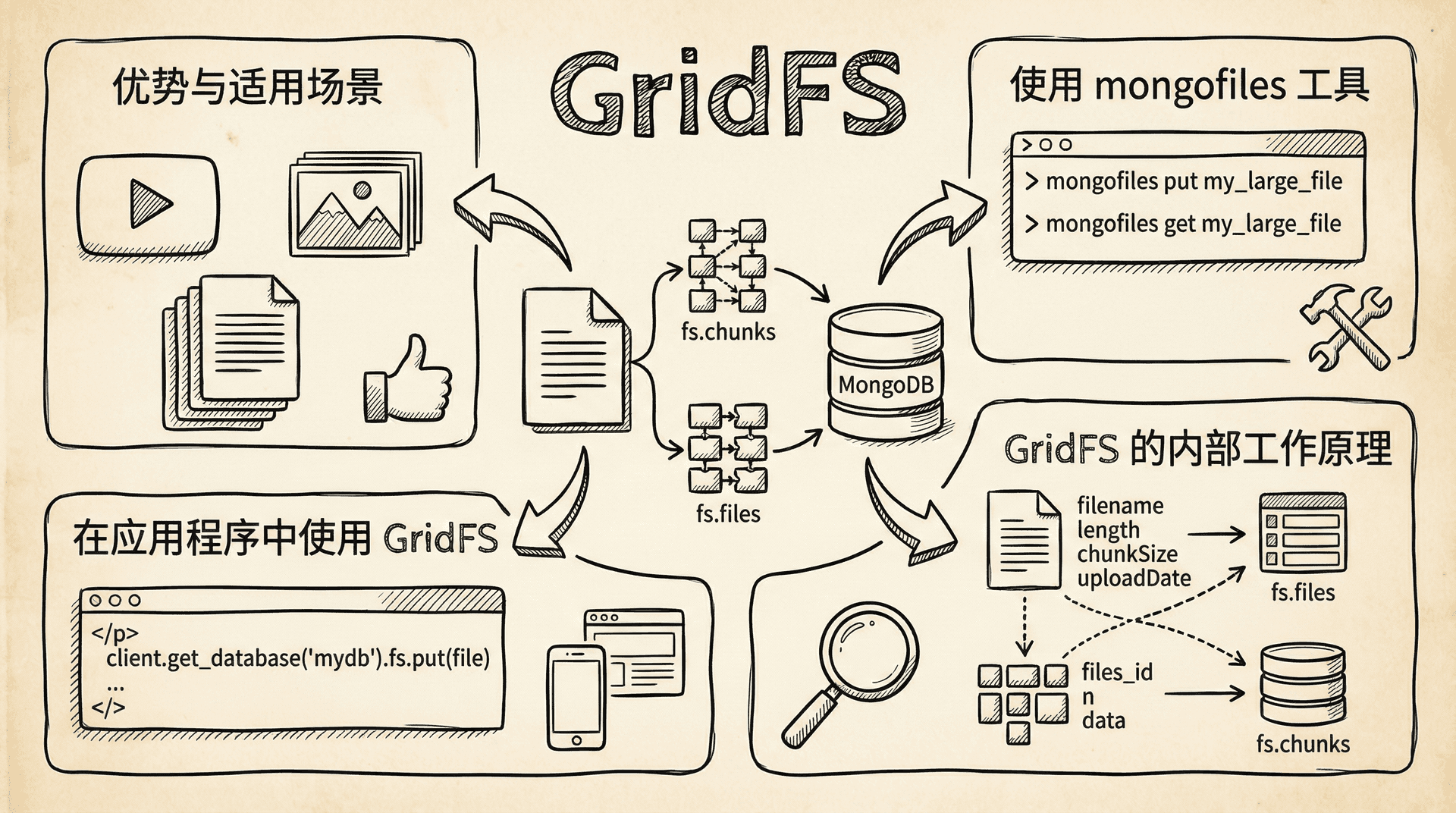 在现代Web应用中,文件存储是一个常见且重要的需求。用户头像、产品图片、文档附件、视频文件,这些多媒体内容让应用变得丰富多彩,但同时也带来了存储挑战。 传统的做法是将文件存储在文件系统中,然后在数据库中保存文件路径。但这种分离式的存储方案在备份、复制和一致性管理方面存在复杂性。MongoDB 的 GridFS 为这个问题提供了一体化的解决方案。