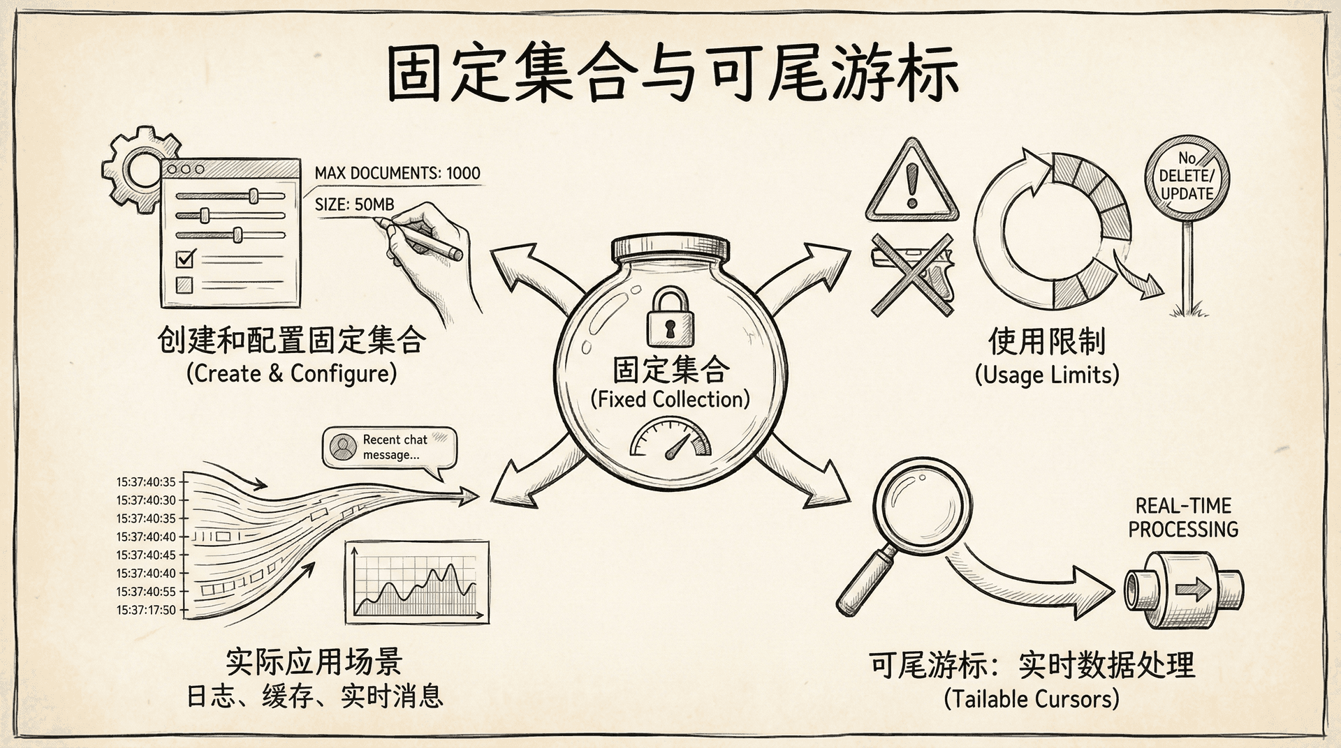 在现代应用中,我们经常需要处理持续产生的数据流,比如应用程序日志、实时消息、传感器数据或用户活动记录。这些数据通常有一个共同特点:数据量大、写入频繁,但我们只关心最近的数据。固定集合(Capped Collections)就是为这类场景专门设计的特殊集合类型。