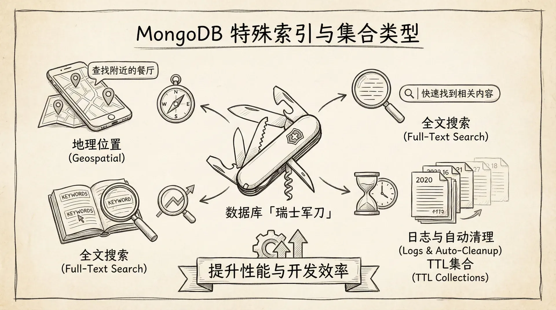 在 MongoDB 的世界中,除了我们熟悉的普通索引和集合之外,还有一系列专为特定场景设计的高级功能。这些特殊的索引类型和集合类型就像是数据库中的「瑞士军刀」,每一个都针对特定的应用场景进行了优化,能够显著提升相应场景下的性能和开发效率。