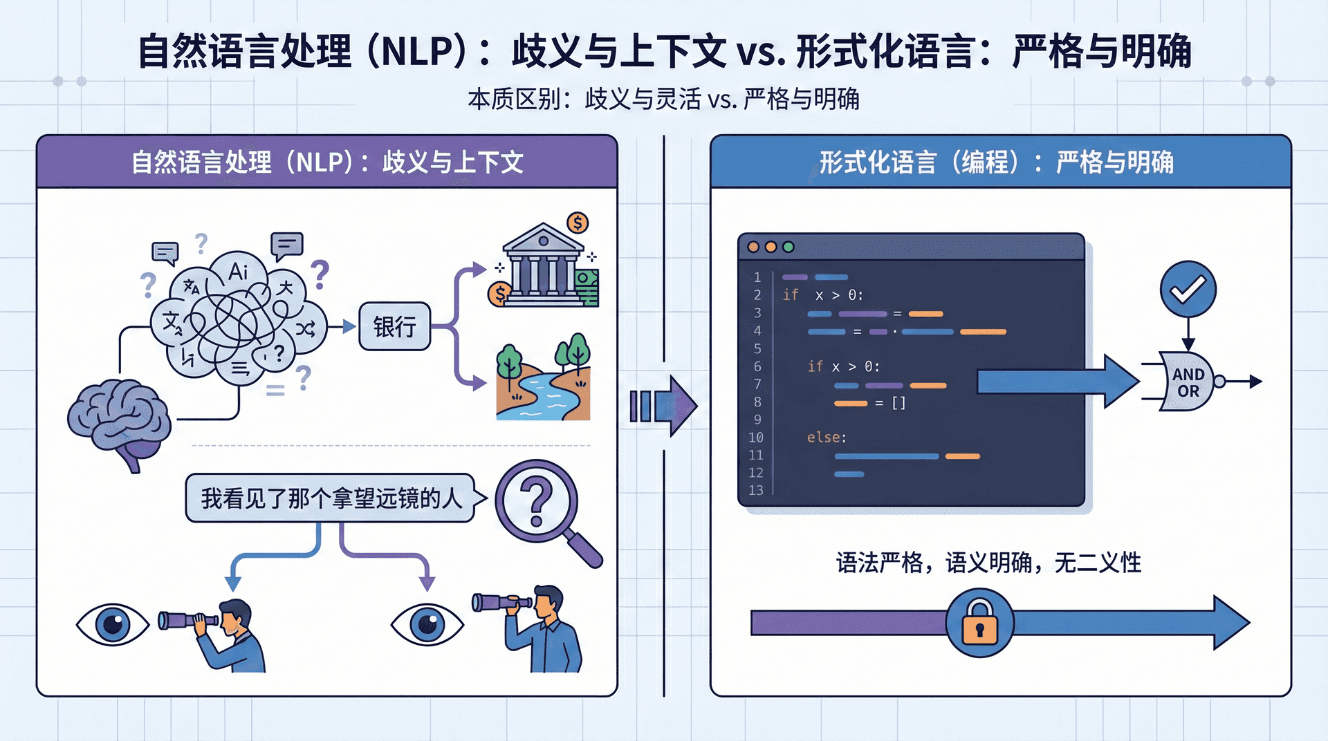 为什么困难?因为自然语言与计算机熟悉的形式化语言(如编程语言)有着本质区别。编程语言的语法严格、语义明确——if x > 0就是if x > 0,没有第二种理解。