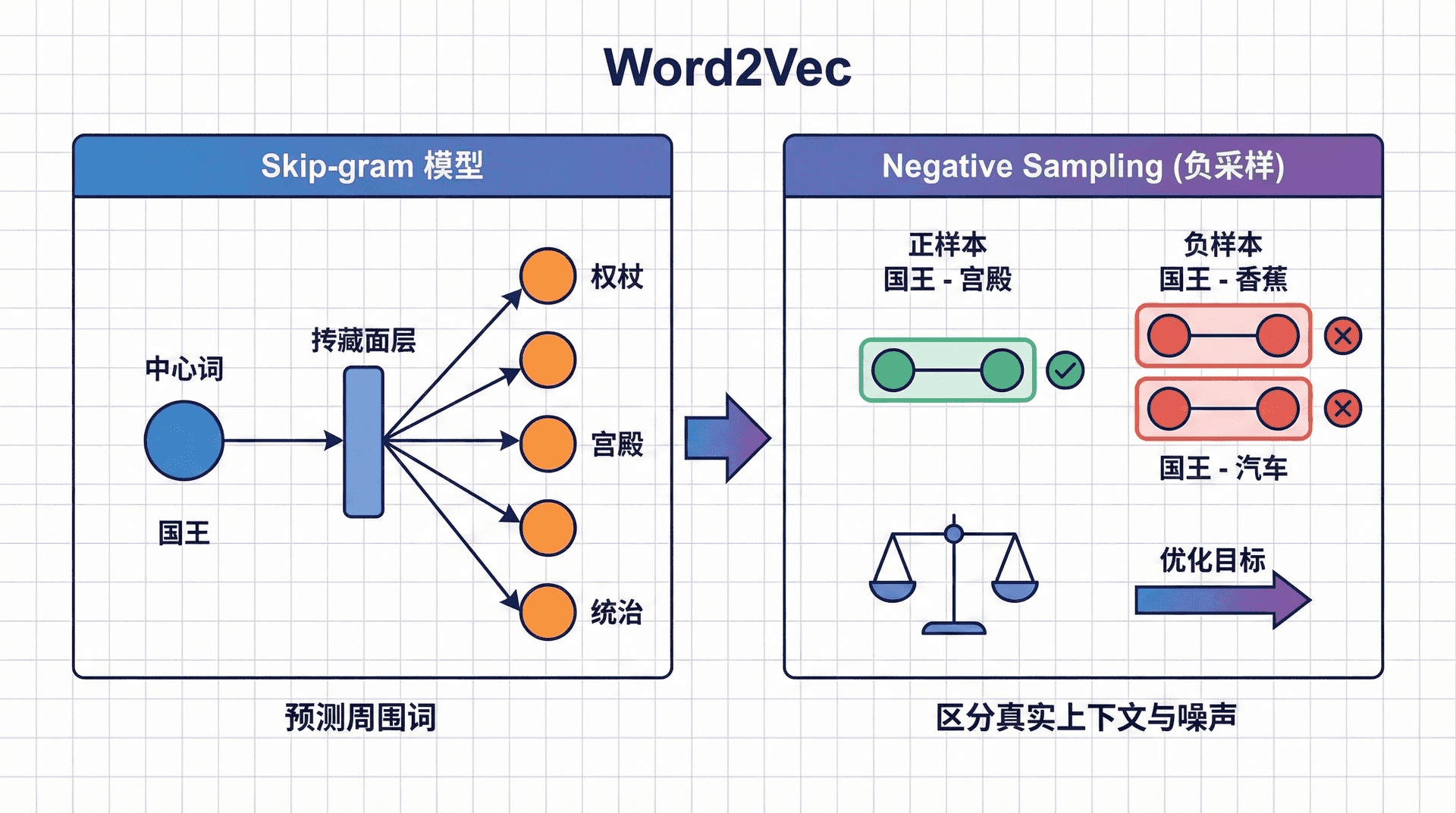 通过Negative Sampling,每次更新只需要计算k + 1 k+1 k + 1 个词的梯度(1个正样本+k k k 个负样本),而不是整个词汇表,训练速度提升了数千倍。