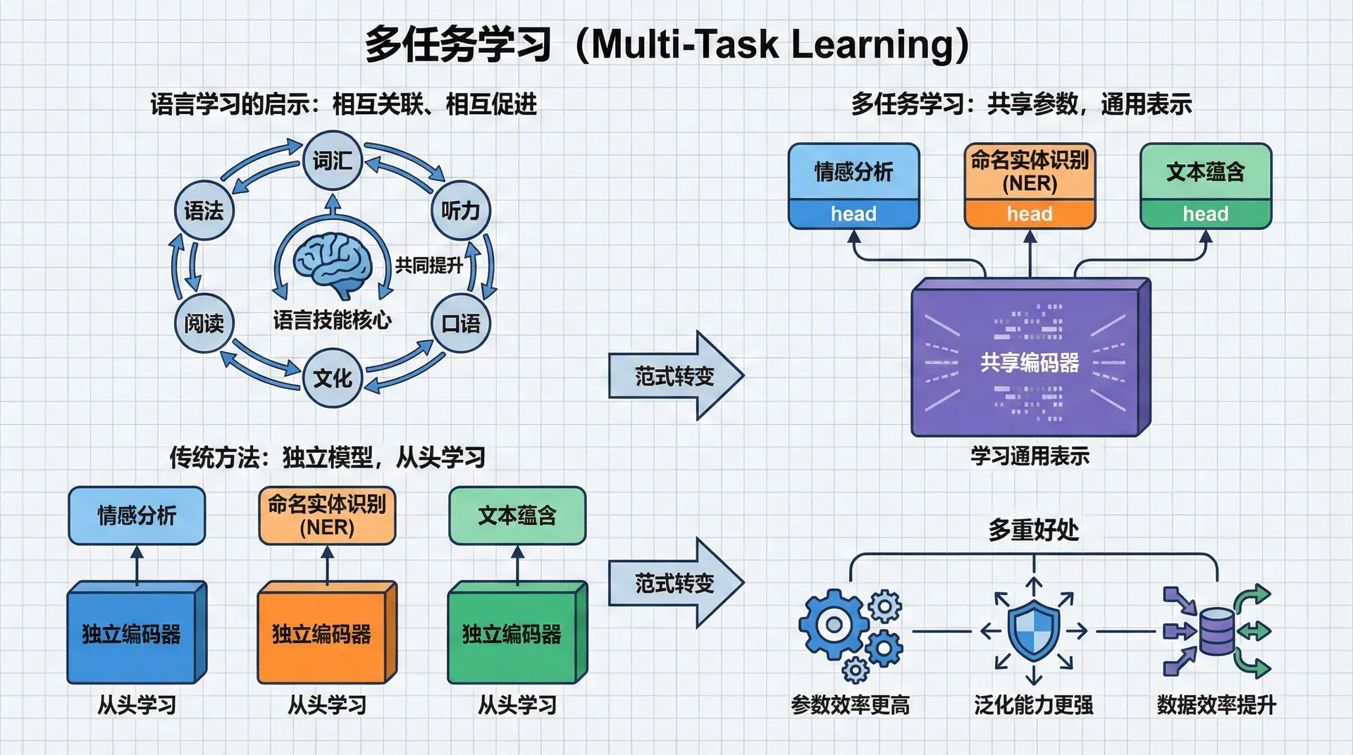 多任务学习改变了这个范式。它让多个任务共享部分模型参数(通常是底层的编码器),强迫这些共享参数学习对所有任务都有用的通用表示。这带来了多重好处:参数效率更高(一个编码器服务多个任务)、泛化能力更强(任务间的互补性起到正则化作用)、数据效率提升(一个任务的数据帮助其他任务)。