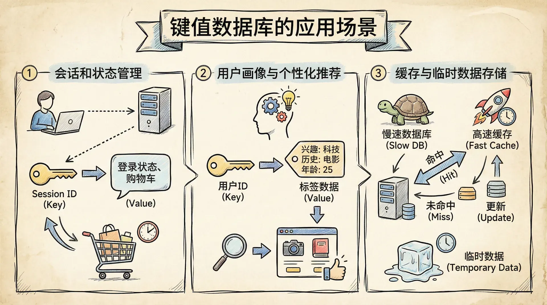Web 应用中的会话(Session)管理是键值数据库的典型应用场景。每当用户登录如京东、天猫等电商平台,系统会为其分配一个全局唯一的会话 ID(session ID),该 ID 作为键值数据库中的 key,映射到存储用户登录状态、购物车条目、浏览历史等内容的 value。