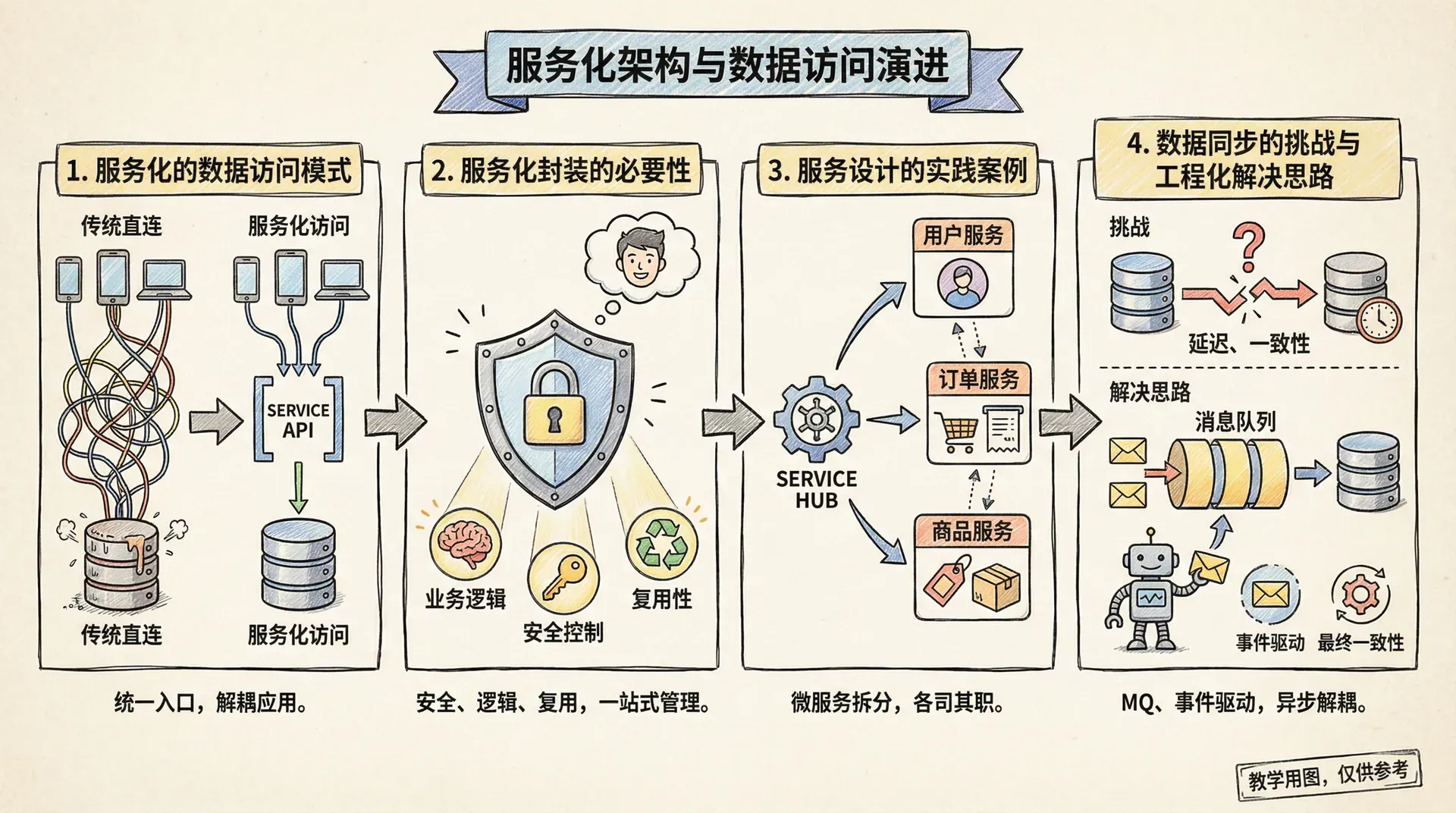 业内最佳实践是通过“服务化”方式对数据访问进行抽象与封装。具体做法为:构建专责的数据服务层,将底层所有数据库的具体细节完全隐藏,对外仅暴露统一、稳定的服务接口。应用层只需与数据服务通信,大幅降低系统复杂度、提升可演化性与运维效率。例如: