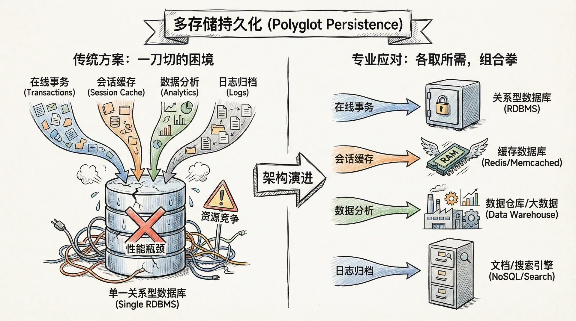 传统方案往往采用单一关系型数据库统一存储各类业务数据,包括在线事务、会话缓存、数据分析及日志归档。这种“一刀切”的模式带来的后果是:资源竞争严重、性能瓶颈明显、扩展维护成本高企。多存储持久化架构正是对此的专业应对,通过针对性地选择合适的数据存储方案,满足各业务模块的特定需求。