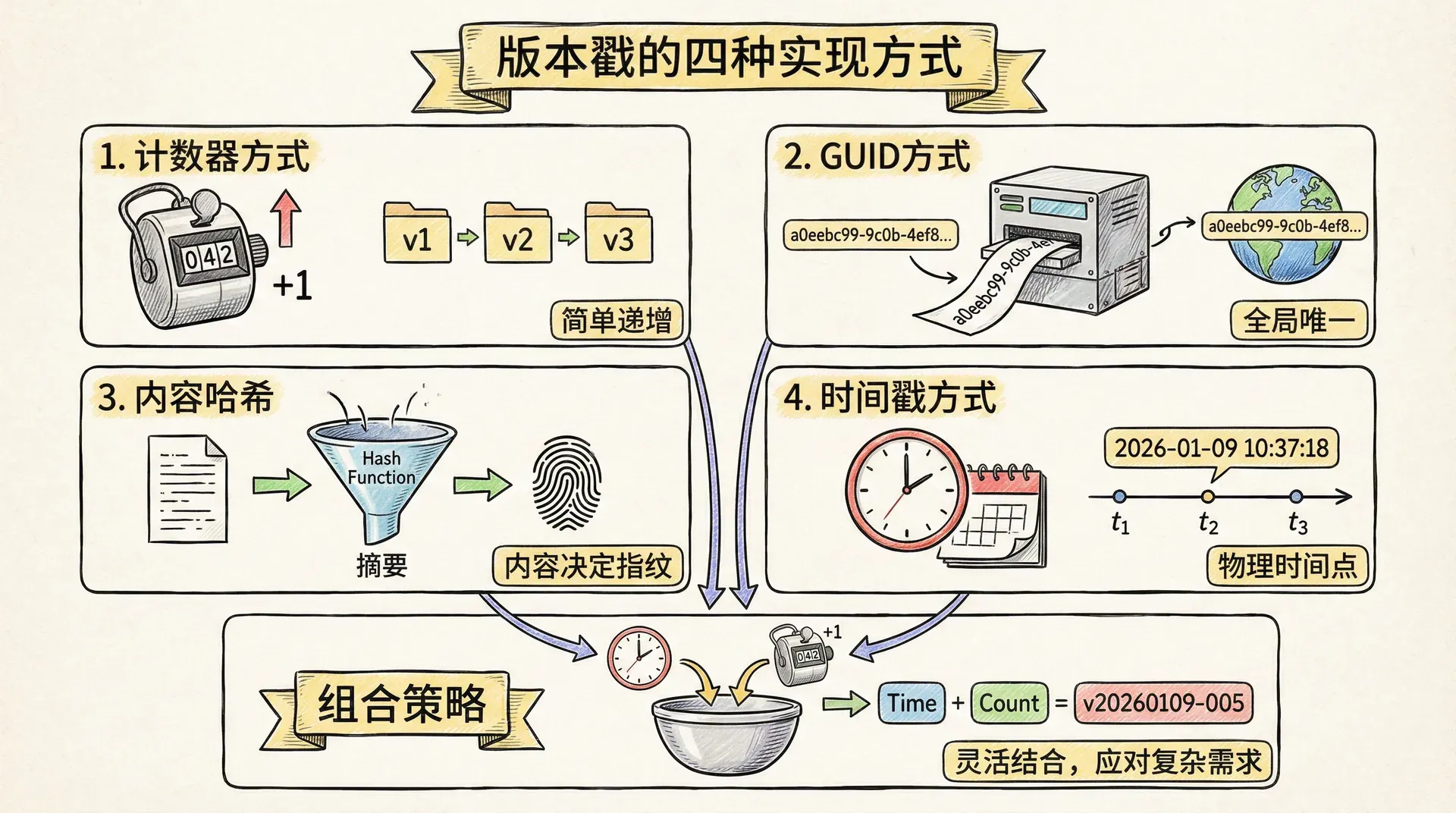 既然版本戳如此重要,那么我们该如何生成这些“时间标签”呢?不同的应用场景需要不同的版本戳策略,让我们来看看四种主要的实现方式。