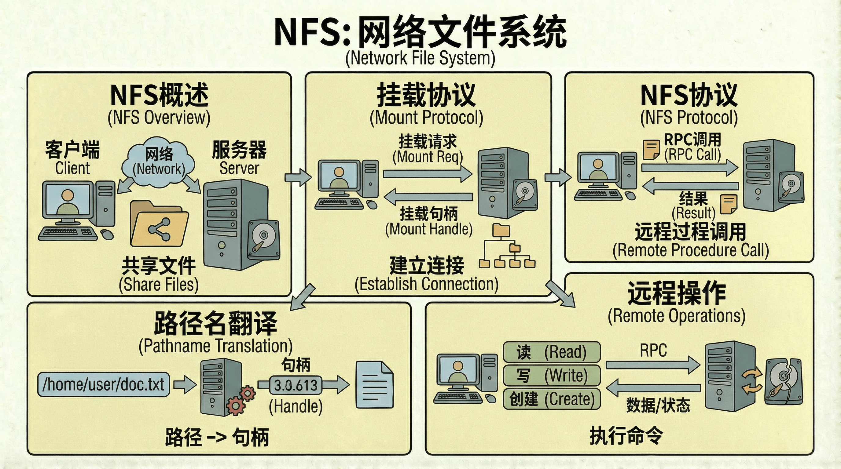 该架构图展示了NFS的工作原理:客户端通过RPC(Remote Procedure Call)调用与服务器通信,文件句柄作为访问远程文件的唯一标识符。