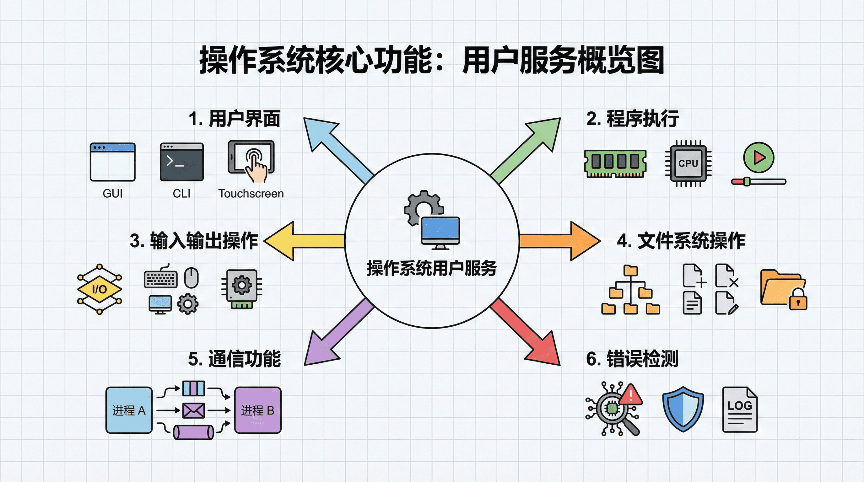 操作系统需要为用户提供便于使用的服务接口,这些服务主要关注用户体验和应用程序的便利性。用户服务包括用户界面、程序执行、输入输出操作、文件系统操作、进程间通信以及错误检测等功能。