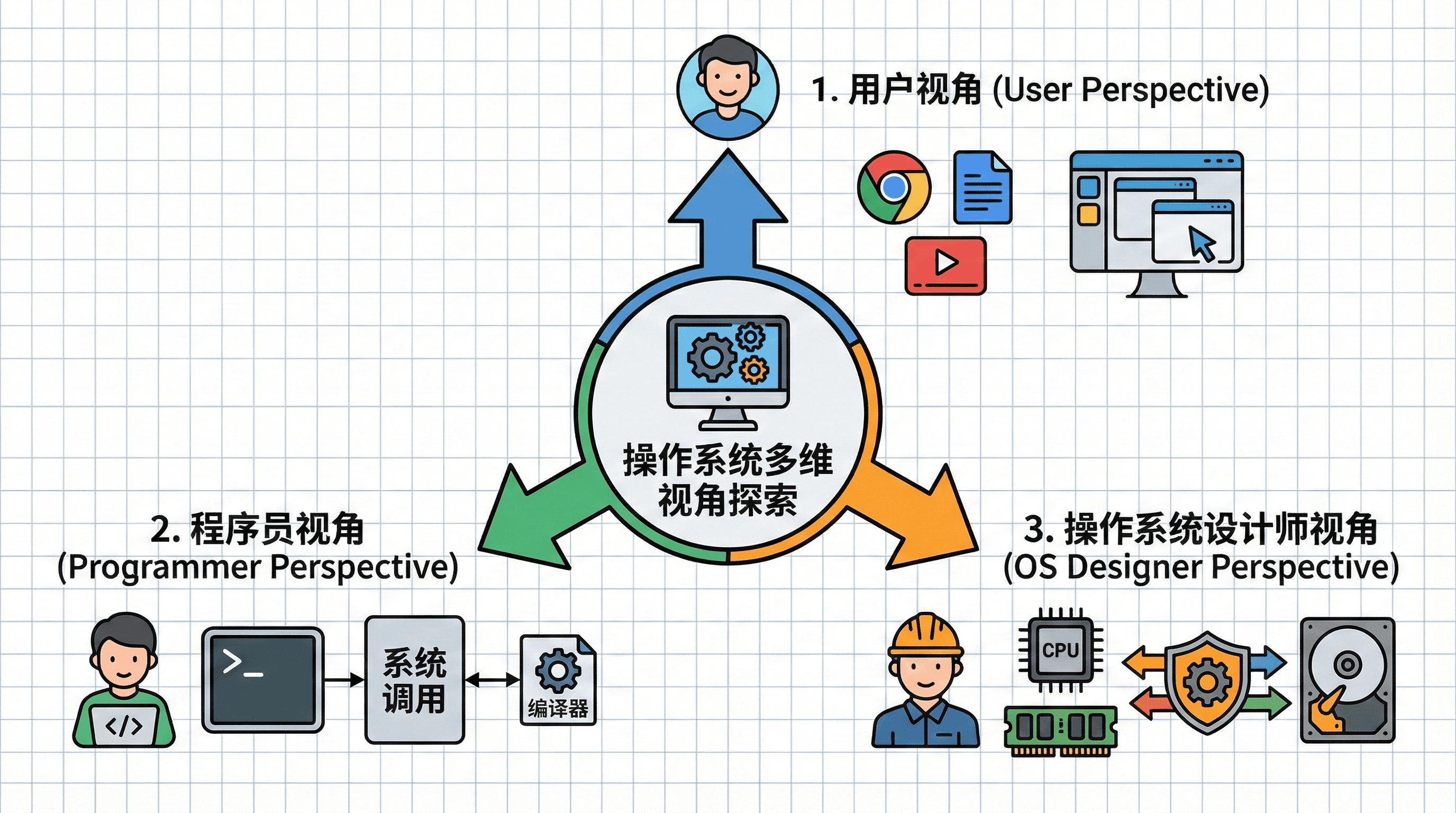 在这一部分,我们将从用户视角、程序员视角和操作系统设计师视角三个不同的维度来探索操作系统的各个方面。