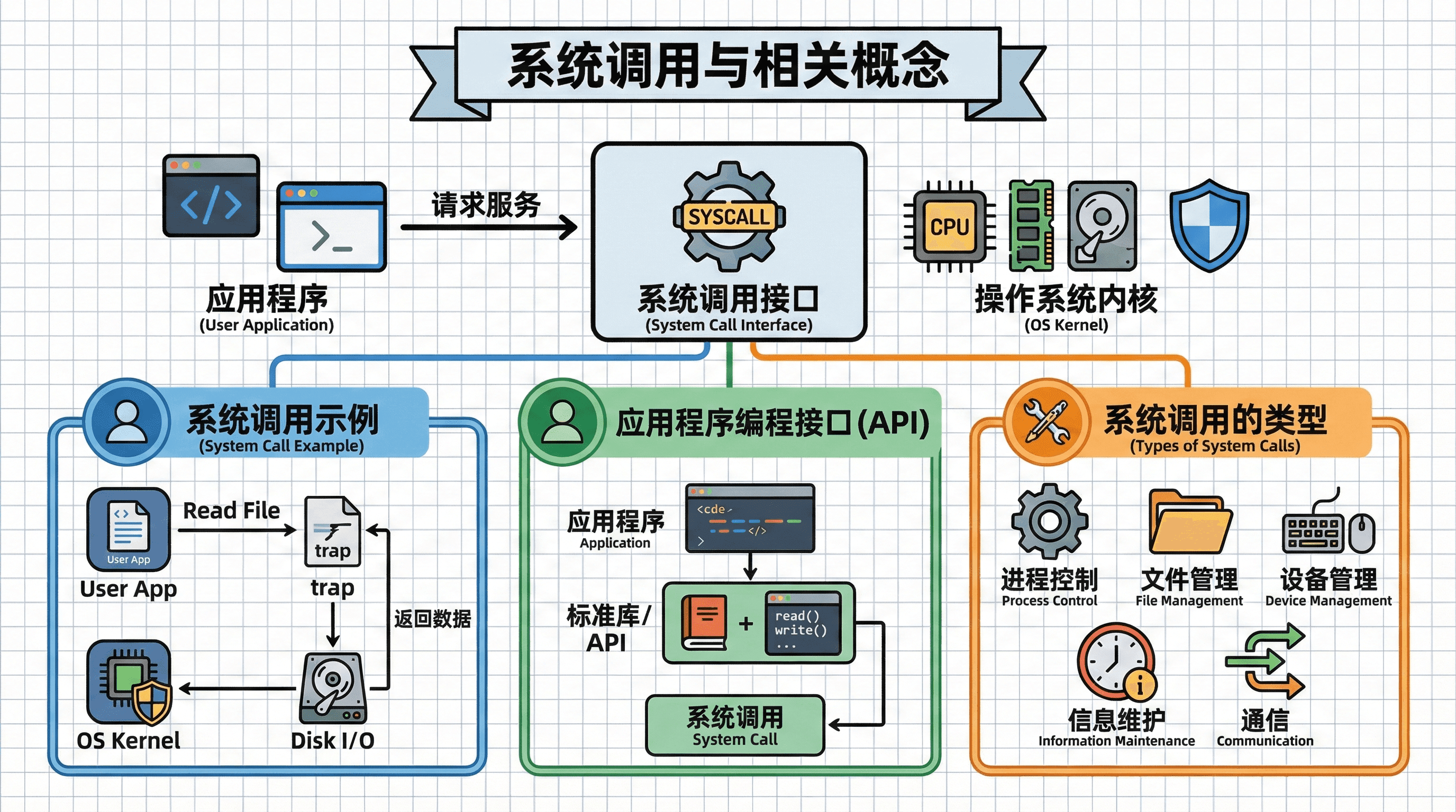 从这个例子可以看出,即使是看似简单的文件复制操作,也需要多次系统调用的协作才能完成。系统调用确保了所有对系统资源的访问都经过操作系统的统一管理和安全检查。
