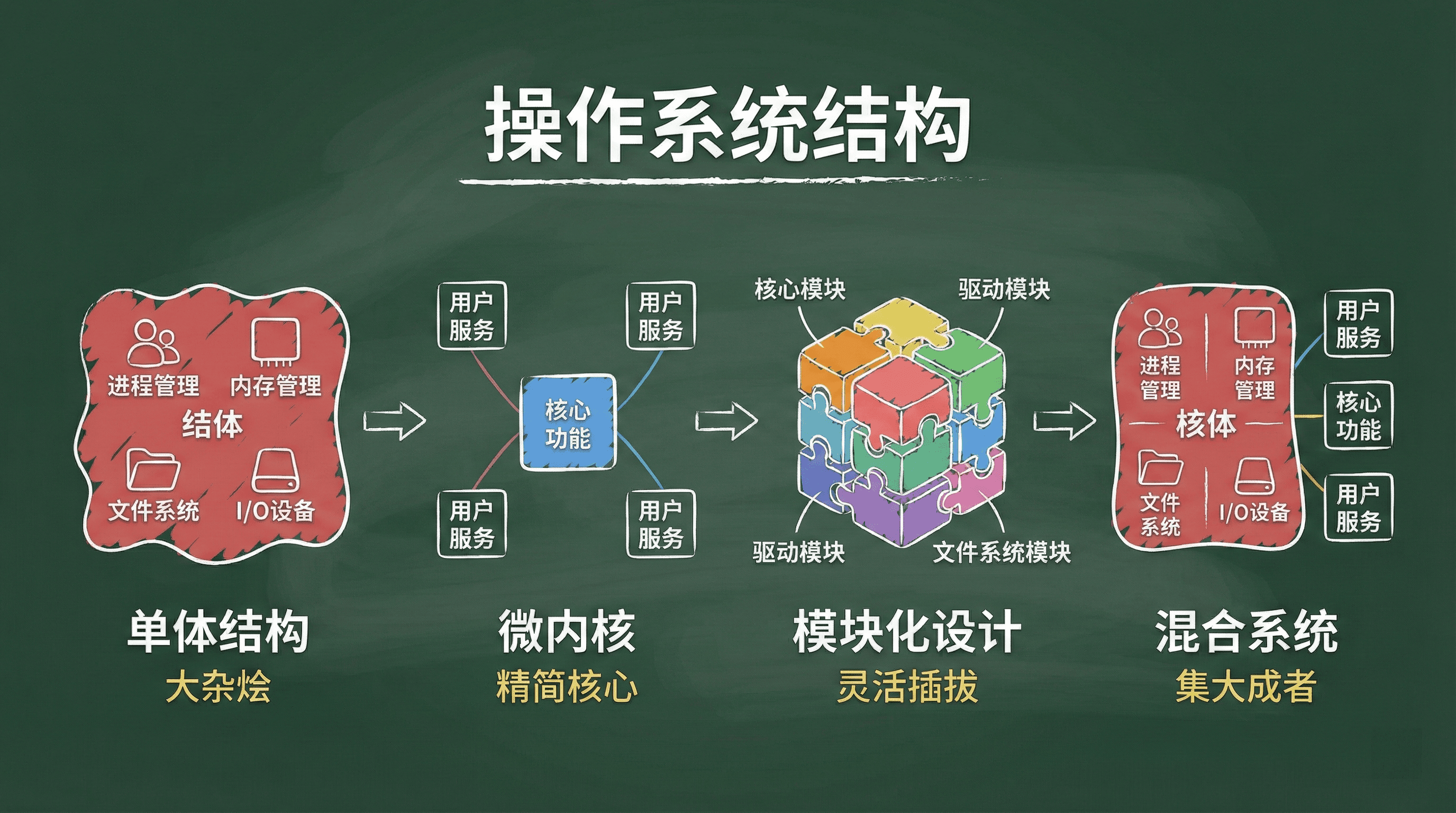 单体结构是最简单直接的操作系统架构设计方式。在单体结构中,操作系统的所有核心功能都实现在一个大的内核程序中,所有功能模块运行在同一个地址空间内,模块之间可以直接调用函数,无需跨进程通信。