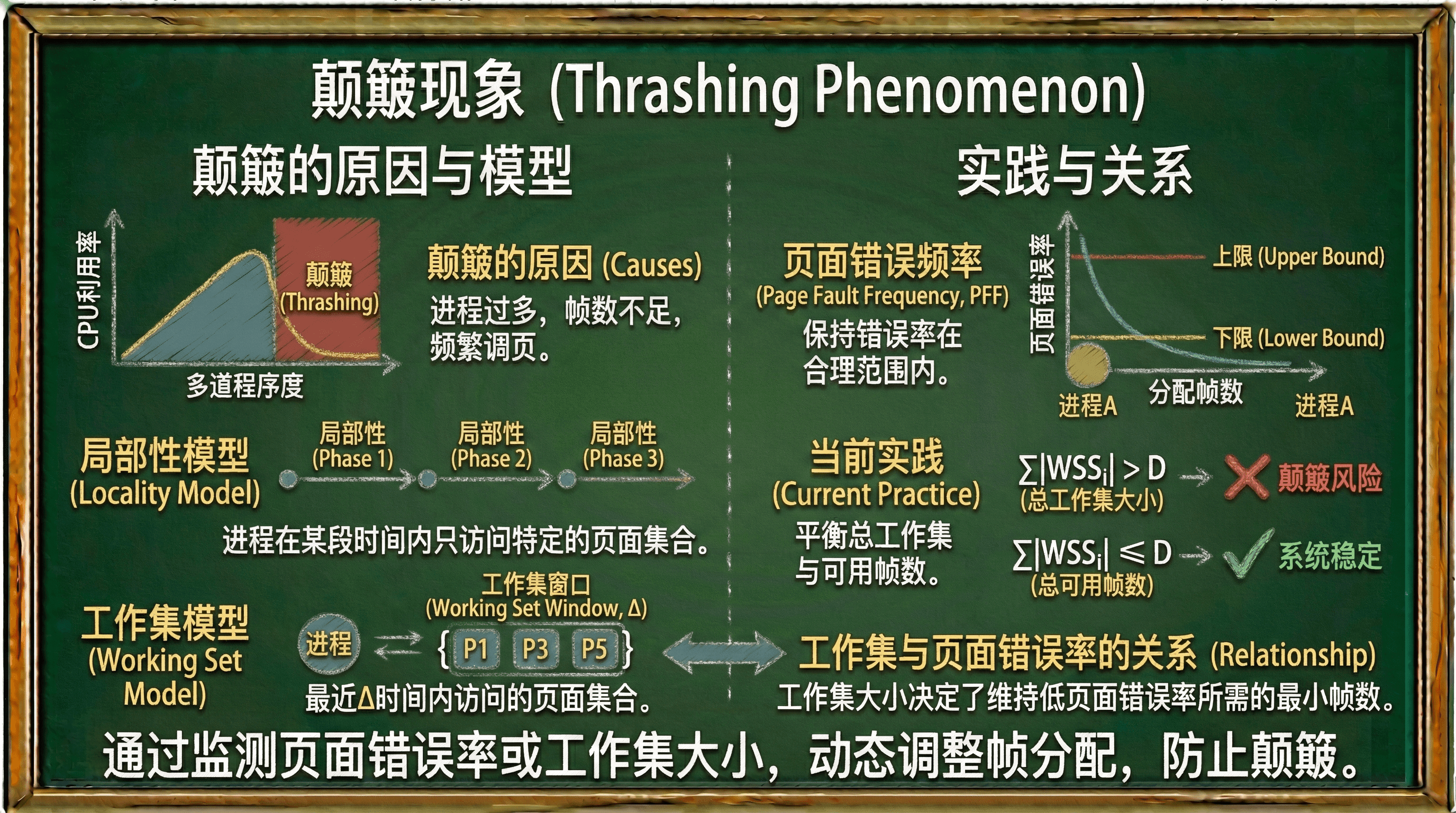 本部分我们详细探讨了虚拟内存的核心机制,包括按需分页、页面置换算法、写时复制等关键技术,以及帧分配策略、颠簸现象防治、内存压缩等高级特性。然而,虚拟内存的实际实现远比我们在这里介绍的复杂。在实际操作系统中,还需要考虑内存碎片、内存泄漏检测与防治、多级页表优化、TLB管理、NUMA架构适配等诸多因素。