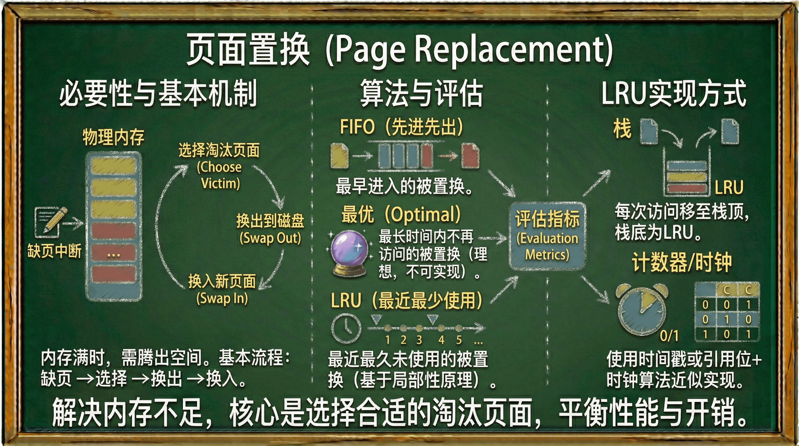 这个流程图展示了页面置换的核心步骤。当没有空闲帧时,系统会选择一个受害页面进行替换。