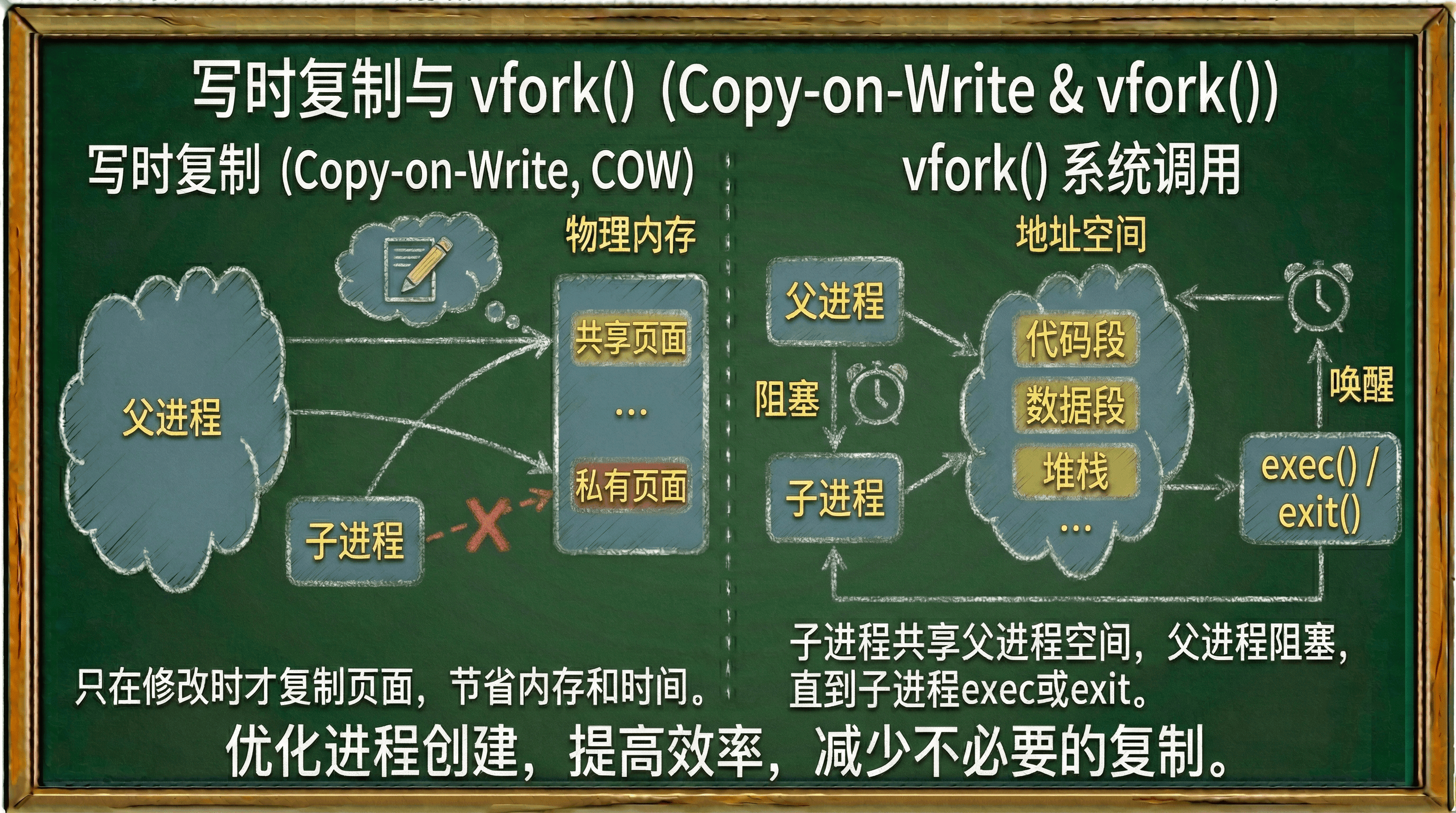 写时复制技术大大提高了进程创建的效率,特别是当子进程在创建后立即执行新程序时。通过延迟页面复制,只有真正需要修改的页面才会被复制,这节省了大量内存和时间。