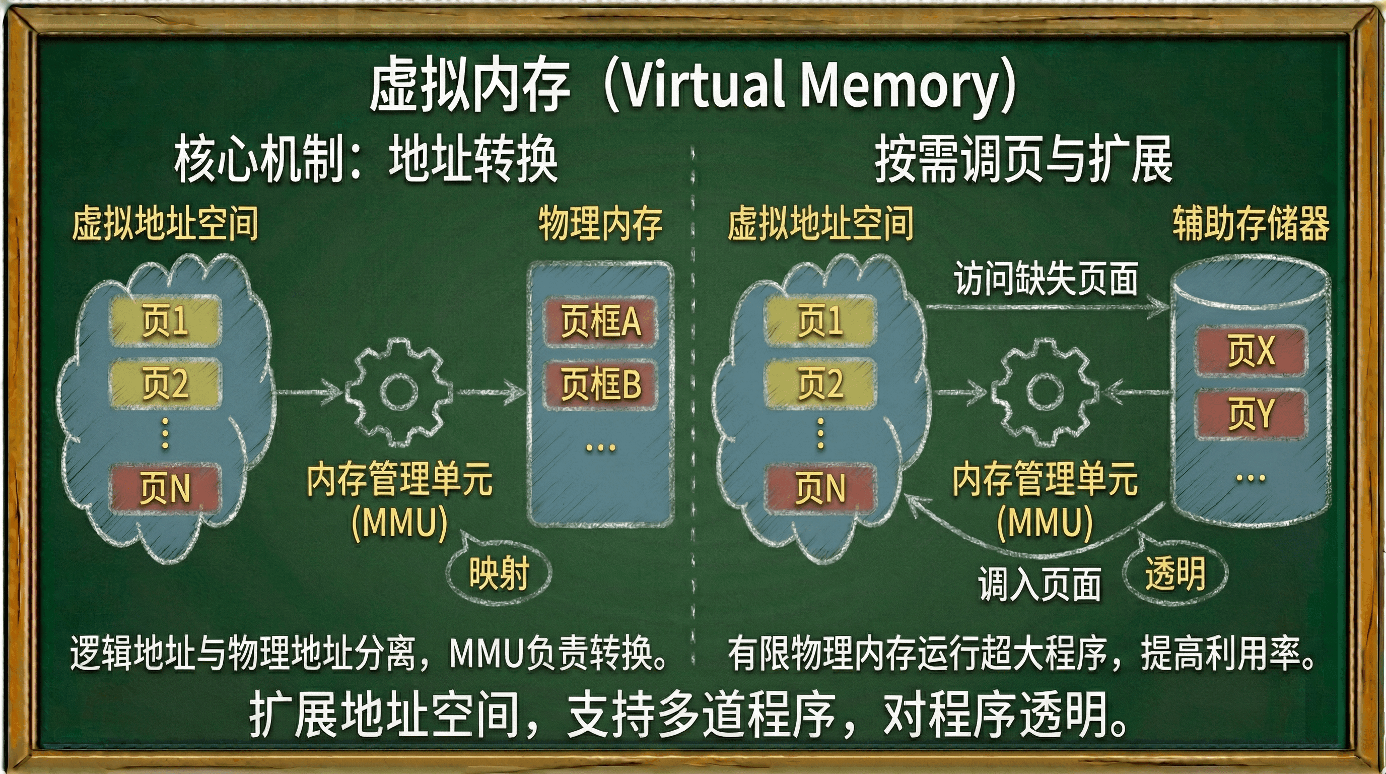 通过页面置换机制,按需分页实现了逻辑内存与物理内存的完全分离。程序员可以在巨大的虚拟地址空间中编程,而无需关心物理内存的实际容量限制。