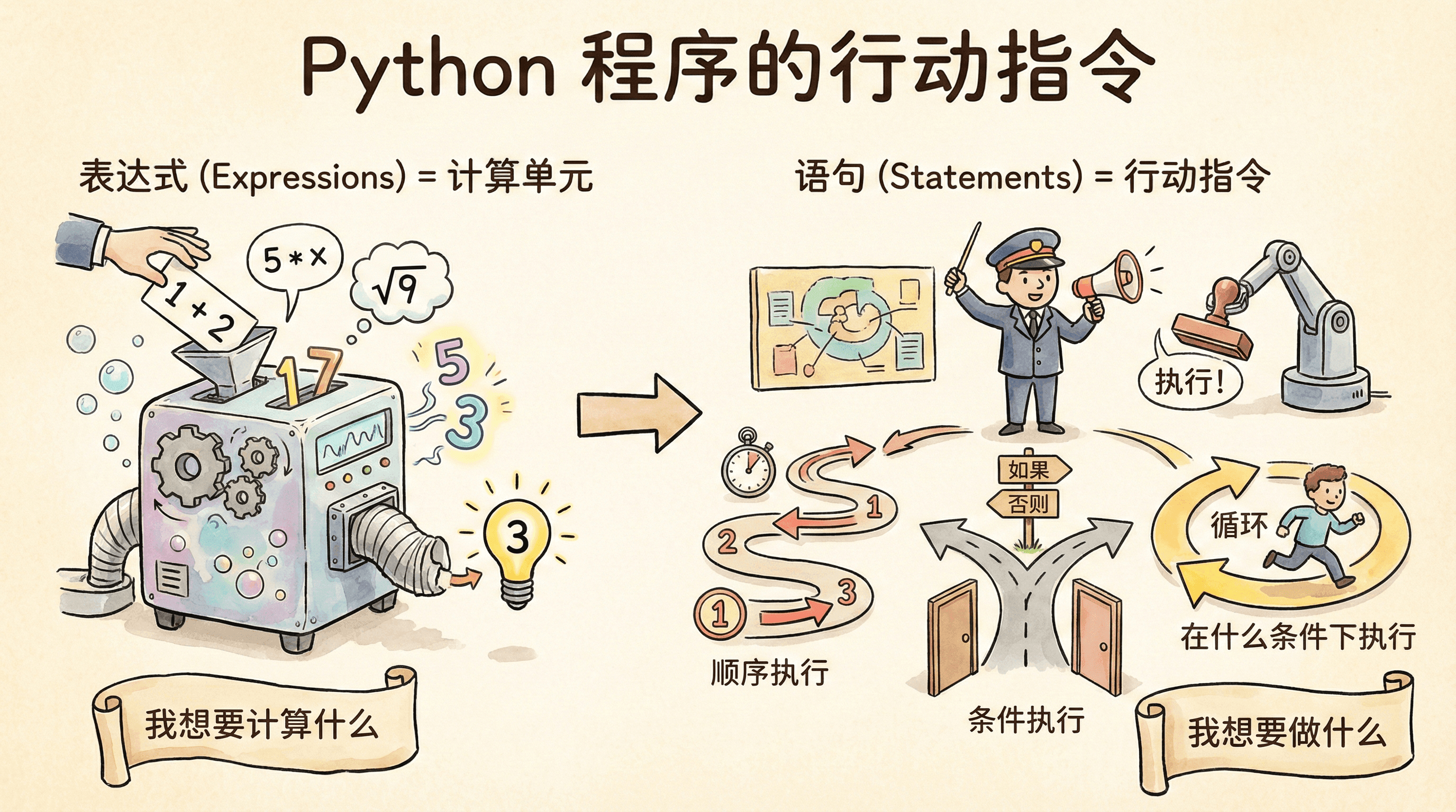 如果说表达式是程序的“计算单元”,那么语句就是程序的“行动指令”。语句告诉Python解释器应该执行什么操作,以什么顺序执行,在什么条件下执行。