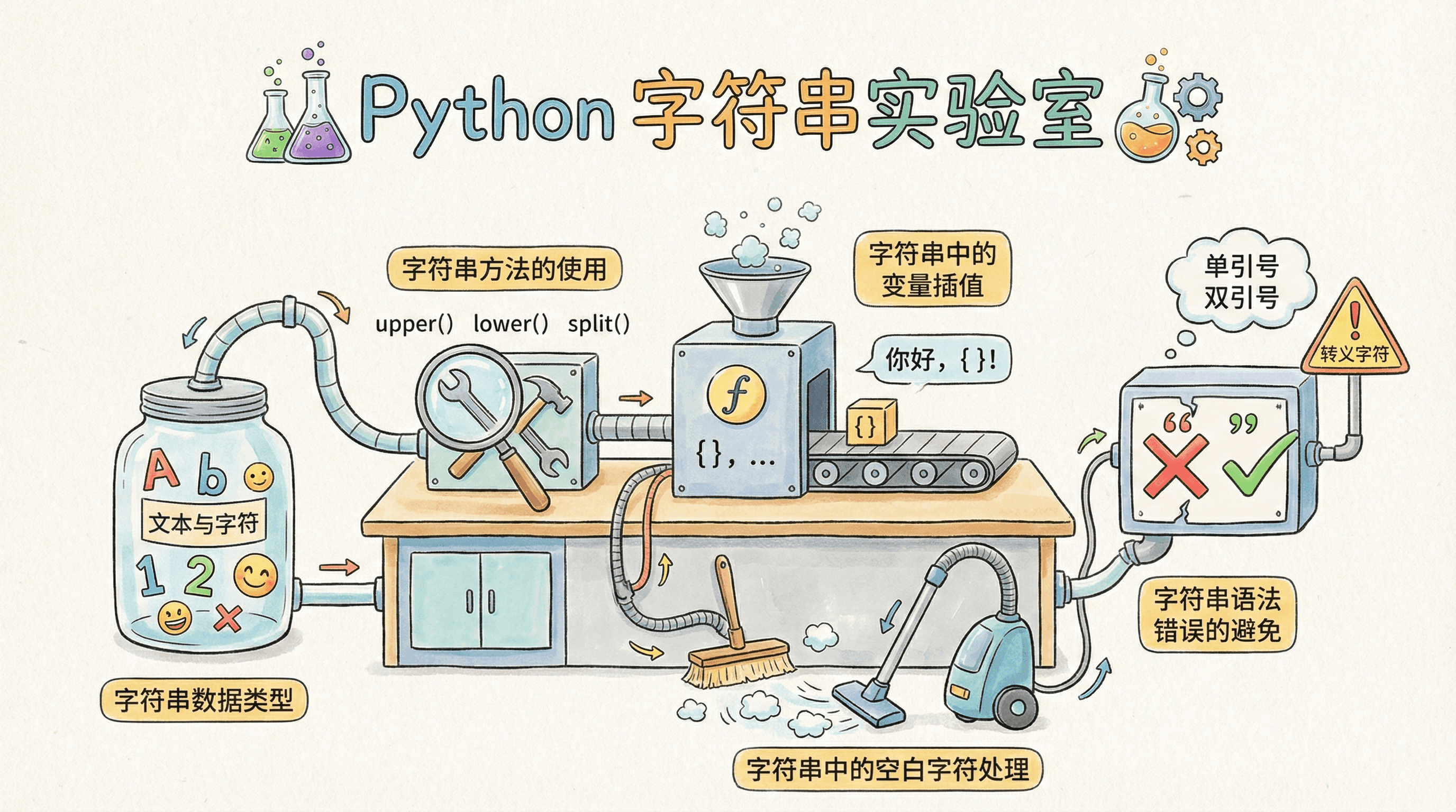 字符串是程序中最常用的数据类型之一,它用来表示文本信息。在Python中,任何被引号包围的内容都被视为字符串。我们可以使用单引号或双引号来创建字符串:
