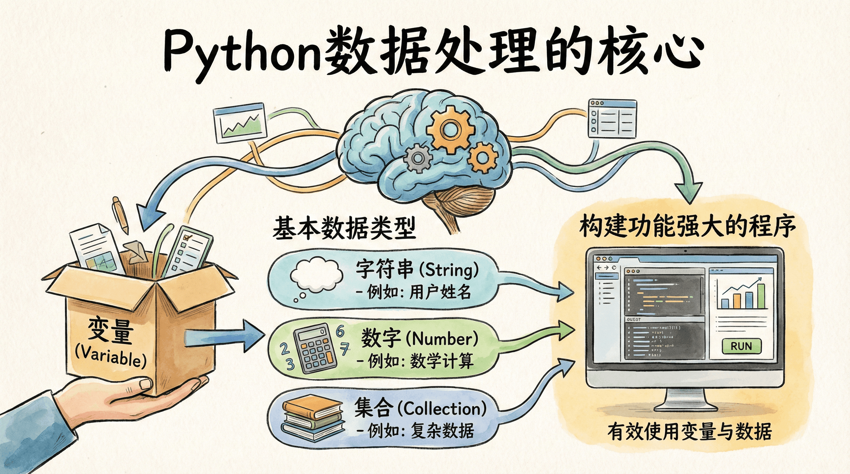 Python程序的核心在于处理各种类型的数据。无论是存储用户的姓名、计算数学公式的结果,还是管理复杂的数据集合,我们都需要了解如何在Python中有效地使用变量和不同的数据类型。 在这一部分,我们将深入探讨Python中的基本数据类型,学习如何创建和使用变量,以及如何操作这些数据来构建功能强大的程序。