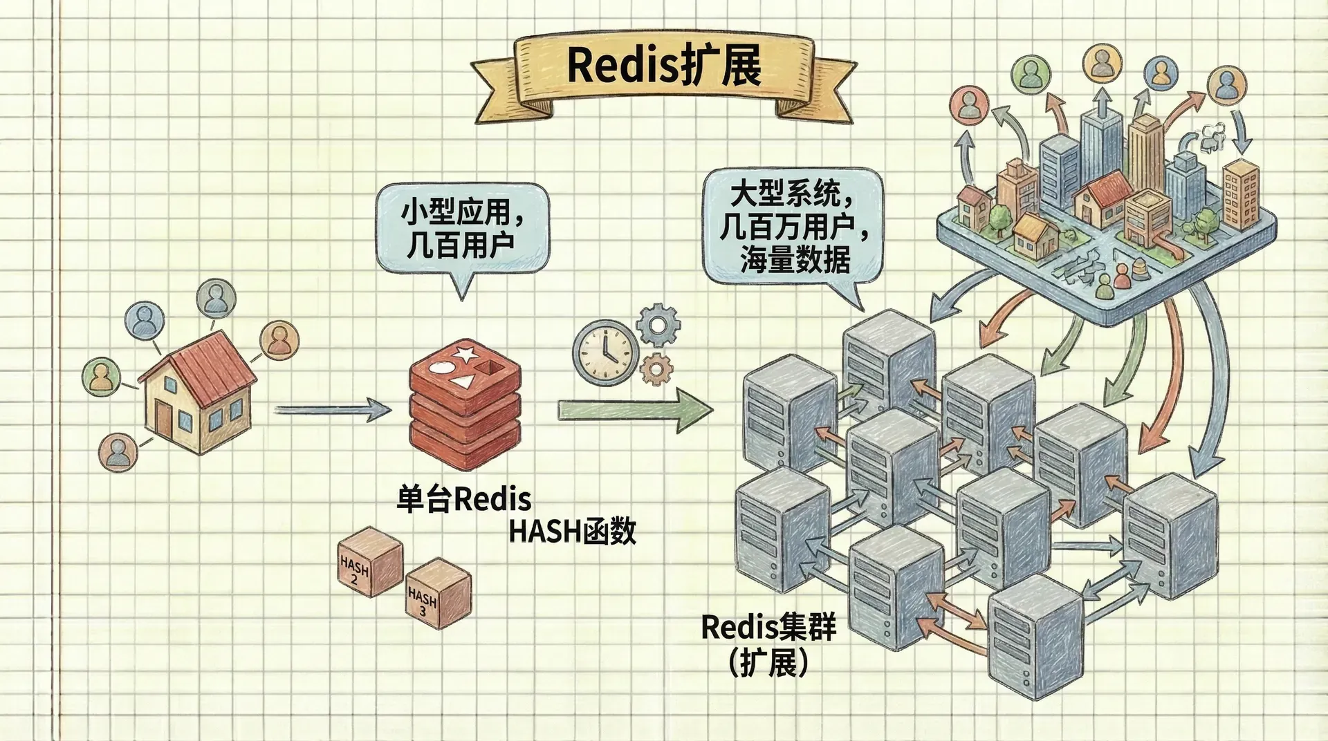 当我们的小型应用逐渐成长为大型系统时,单台Redis服务器往往无法满足我们的需求。如果你的电商平台从每天几百个用户增长到几百万用户,或者你的社交应用从简单的消息推送发展到需要处理海量用户动态的复杂系统。
