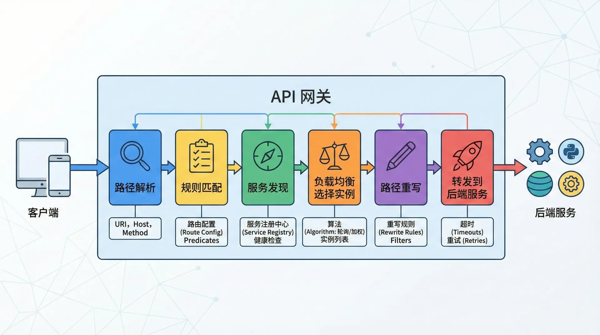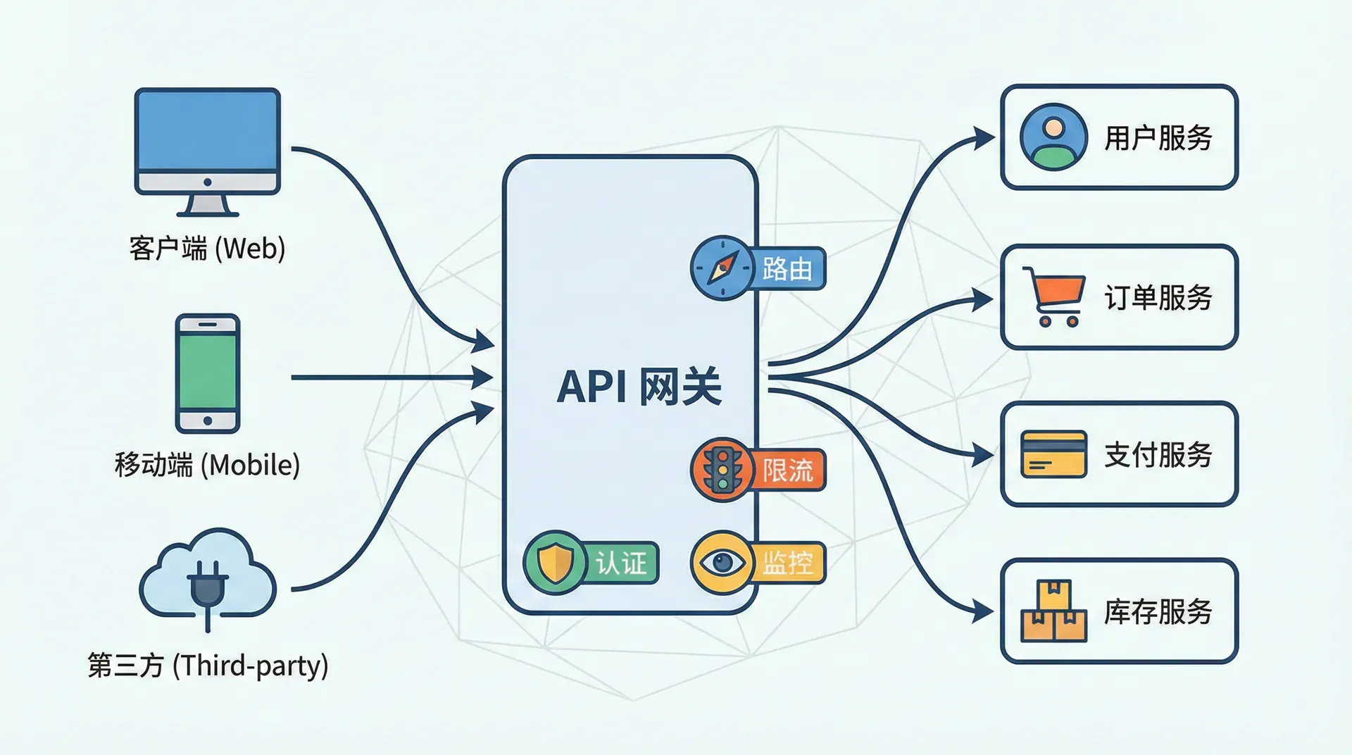 API 网关通过在客户端和后端服务之间引入一个中间层,优雅地解决了这些问题。客户端只需要与网关交互,由网关负责路由请求到正确的服务,处理各种横切关注点,并在必要时进行协议转换。