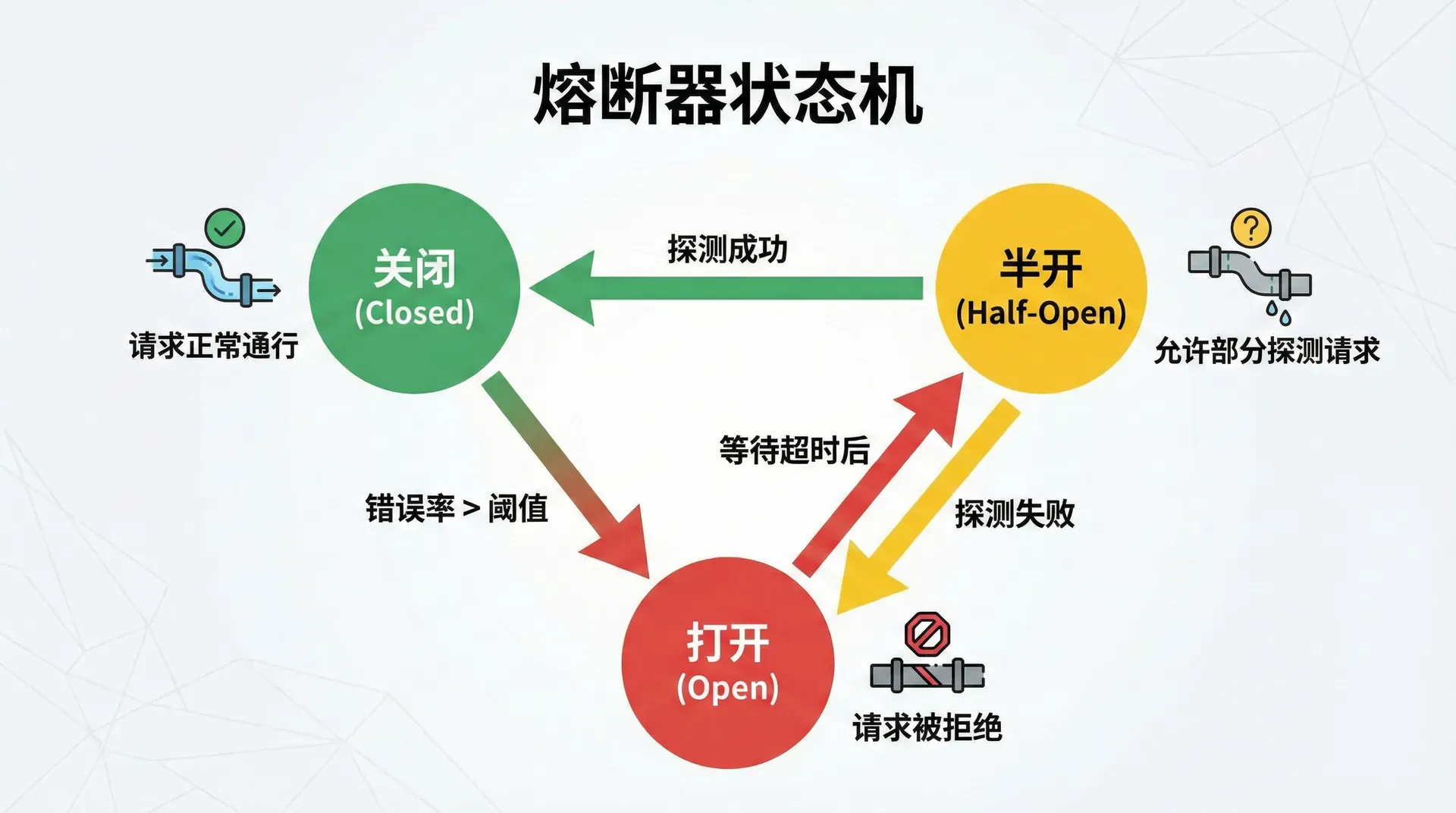 熔断器通常有三个状态。关闭状态是正常工作状态,请求正常转发到后端服务。打开状态是熔断激活状态,所有请求直接失败,不调用后端。半开状态是恢复探测状态,允许少量请求通过以测试后端是否恢复,如果成功则关闭熔断器,否则继续保持打开。