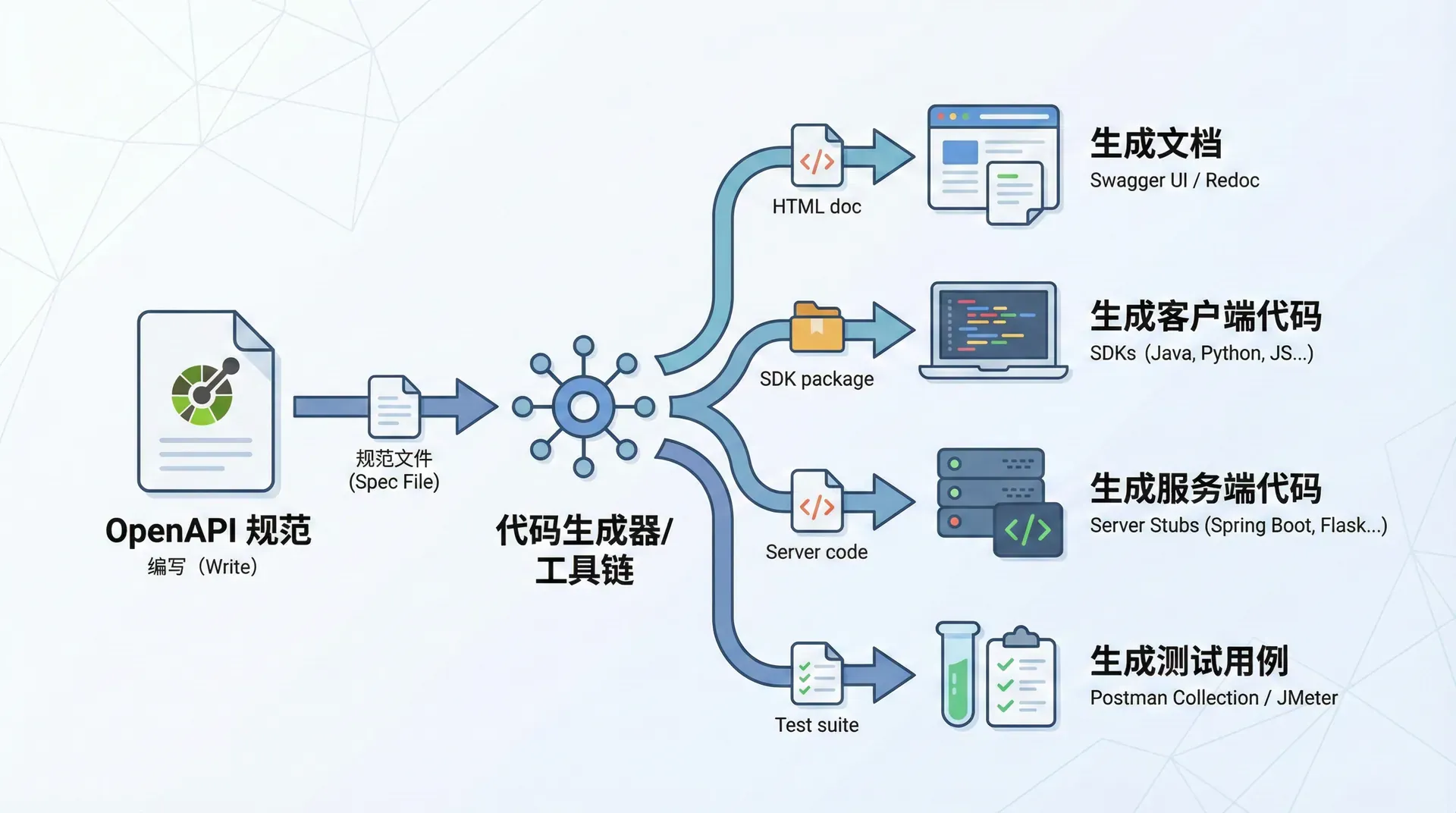 OpenAPI 规范的价值在于它提供了机器可读的 API 描述,使得可以自动生成文档、客户端代码、测试用例等。这种自动化大大提高了开发效率,减少了手动维护的工作量。