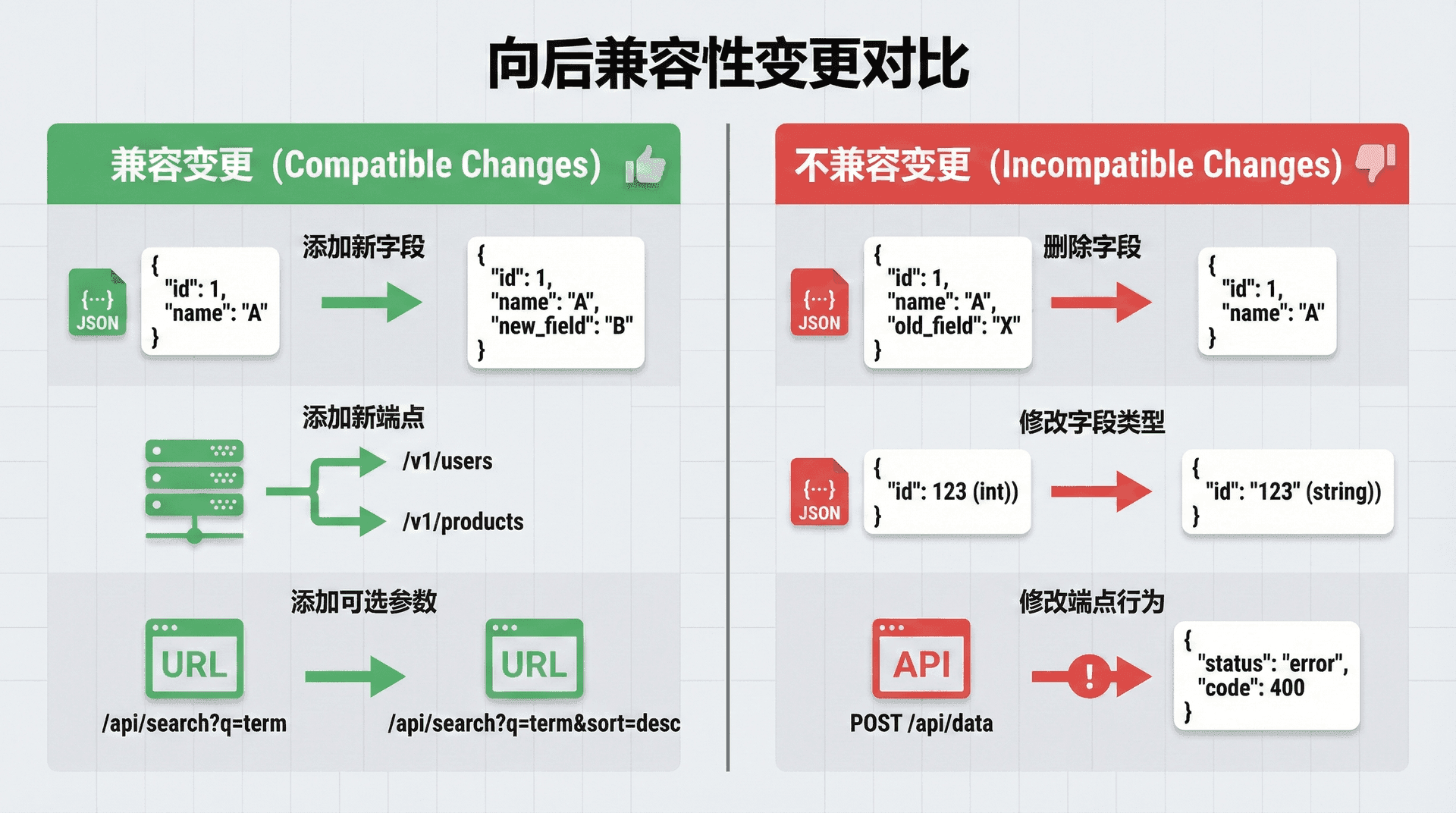 修改现有字段的类型、删除字段、修改端点的行为通常是不兼容的。这些变更会导致老客户端无法正常工作,需要引入新版本。