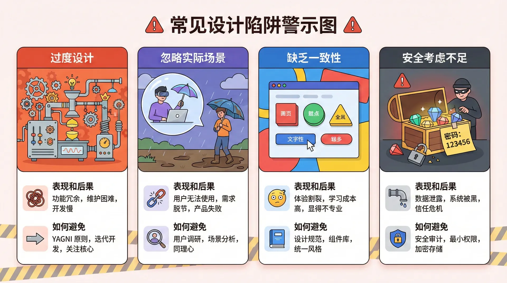 过度设计是 API 设计中常见的陷阱。为了应对未来可能的需求,设计者可能添加过多的抽象、过多的配置选项、过多的功能,导致 API 变得复杂难用。