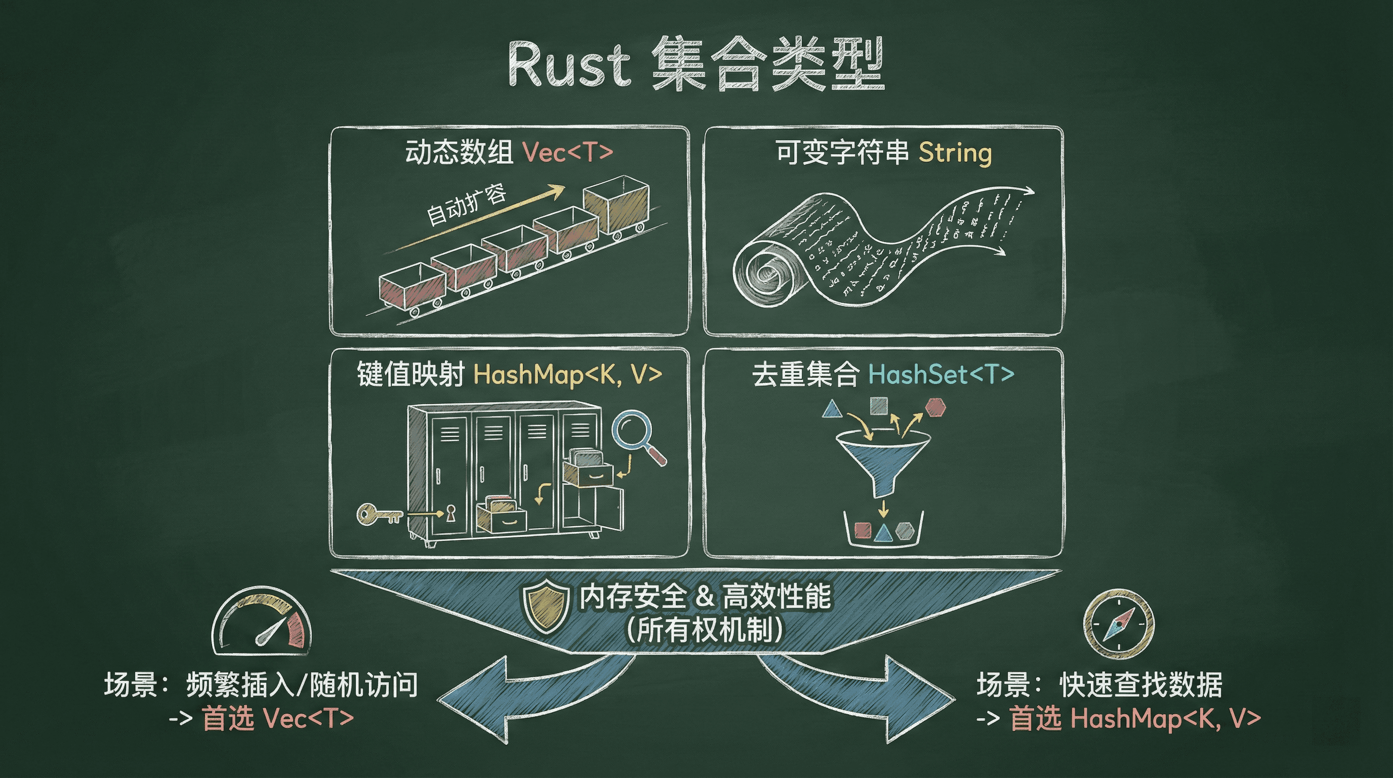 在实际开发中,很多时候我们并不能提前确定数据的数量和边界,这时集合类型就显得尤为重要。Rust 标准库为我们准备了多种常用集合,比如动态数组 Vec<T>、可变字符串 String、键值映射 HashMap<K, V>