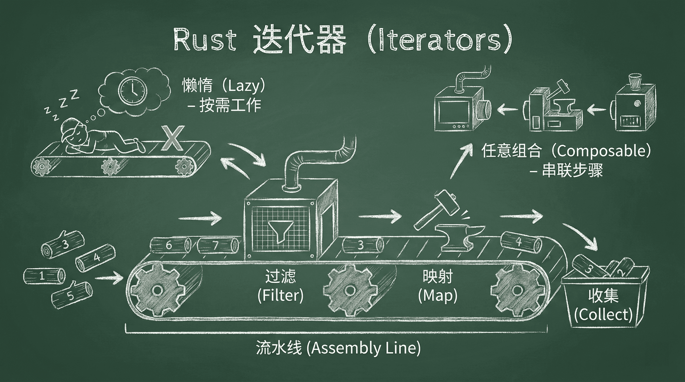在 Rust 的迭代器系统中,我们需要理解两个核心概念:适配器和消费器。它们就像工厂流水线中的不同环节。