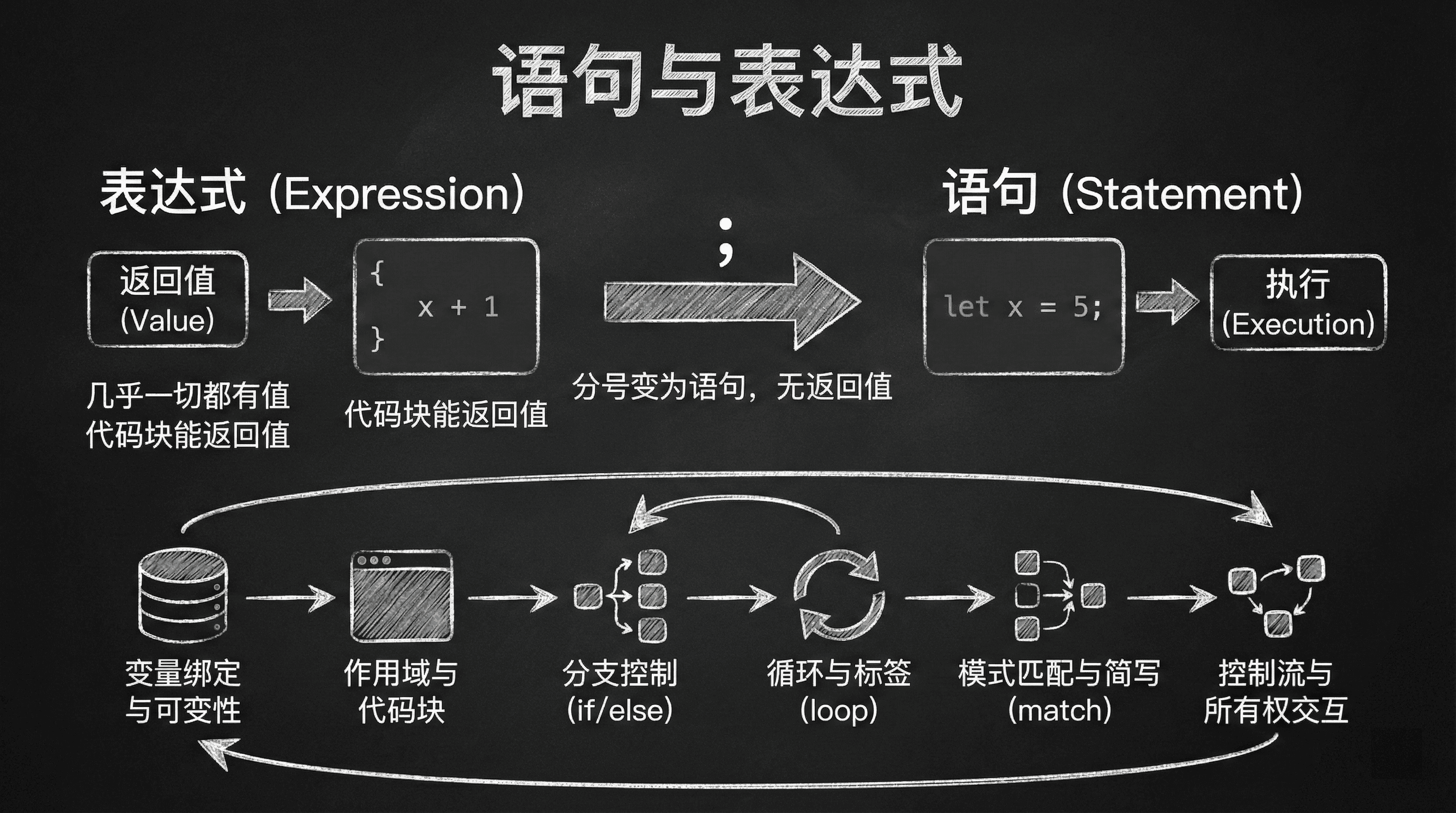 在 Rust 中,语句与表达式构成了代码的基本骨架。Rust 更偏向表达式风格:几乎一切都有值,代码块也能返回值; 但与此同时,分号会把表达式变为语句,从而影响返回值与类型推断。掌握这些基础,我们才能在后续内容中自如地组合控制流、设计函数返回、组织模式匹配与错误传播。